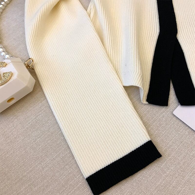 パールとビジューをアレンジしたバータイプのチャームがポイントのニットセーターです。メリハリのあるモノトーンのバイカラーと、細めのリブでスタイルアップが叶います。カーディガンのように見える裾のスリットや控えめなパフスリーブなど、女性らしさを引き立てるデザインでフェミニンな雰囲気に仕上がります。デニムなどカジュアルなアイテムとの相性も良く、お手持ちのボトムスと幅広いスタイリングが楽しめます。