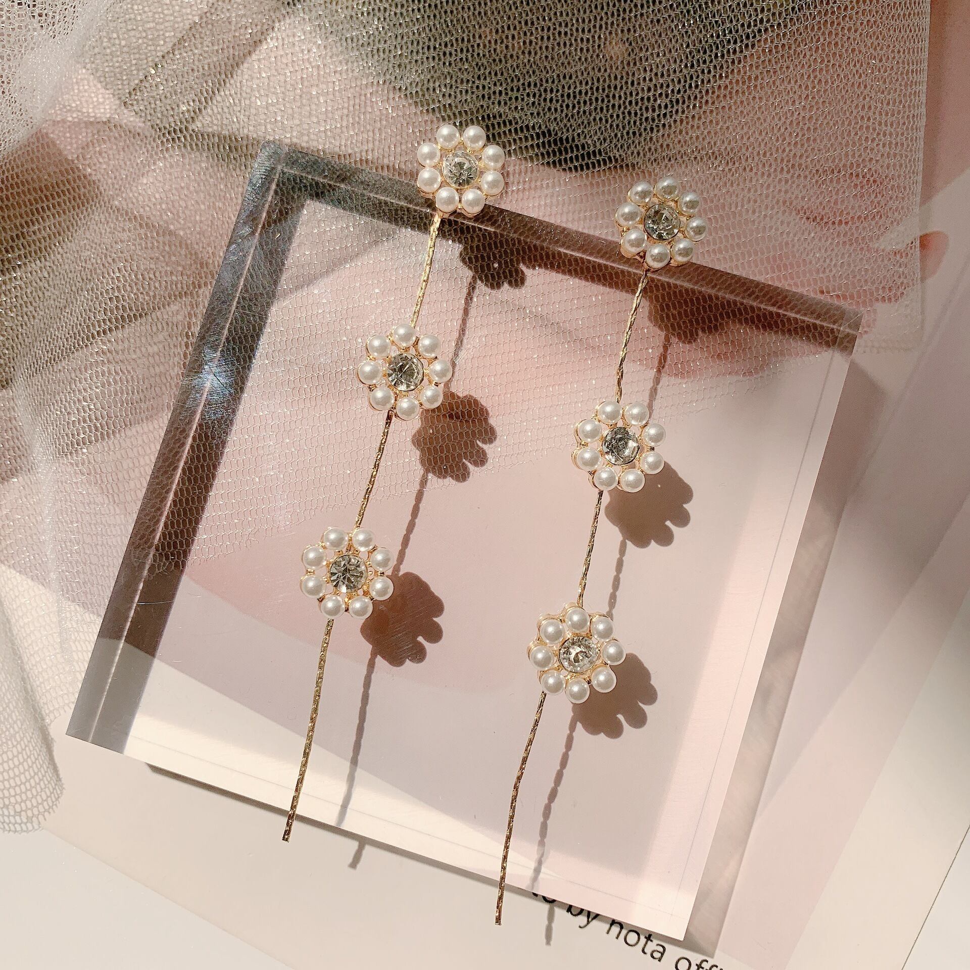 パールとビジューのお花のチャームをつなげたラインドロップピアスです。ロマンティックでフレッシュなデザインで、いつものコーデがリニューアルする飛び道具的なピアスです。繊細さとユニークさどちらも兼ねそろえたデザインで幅広いスタイリングが楽しめます。
