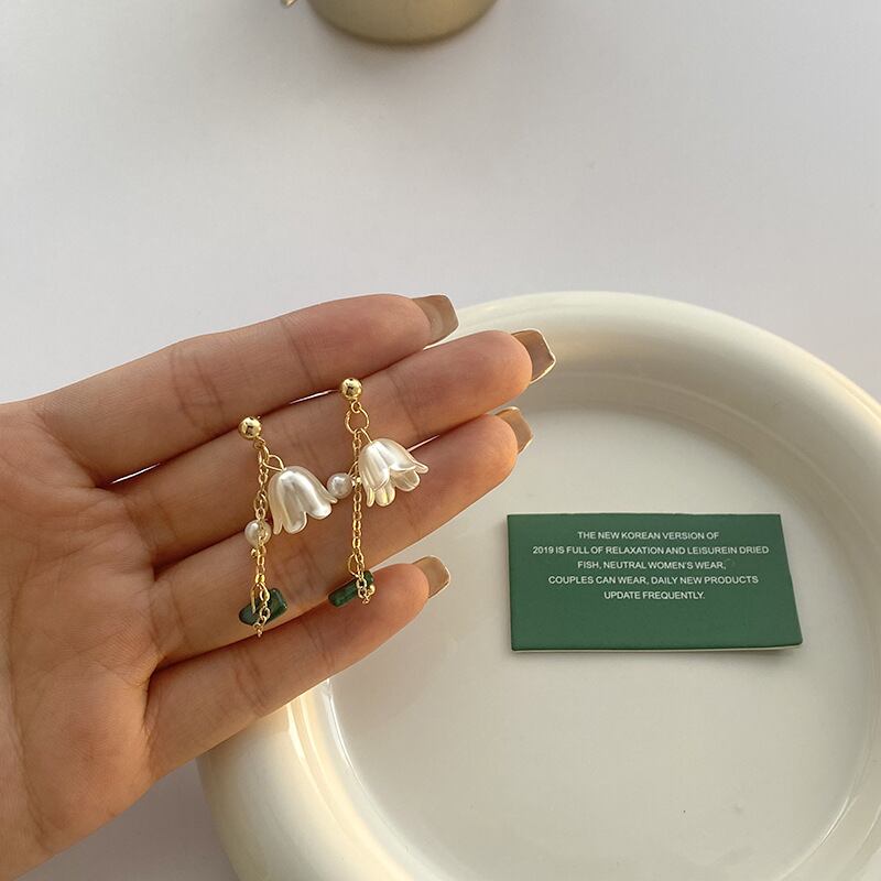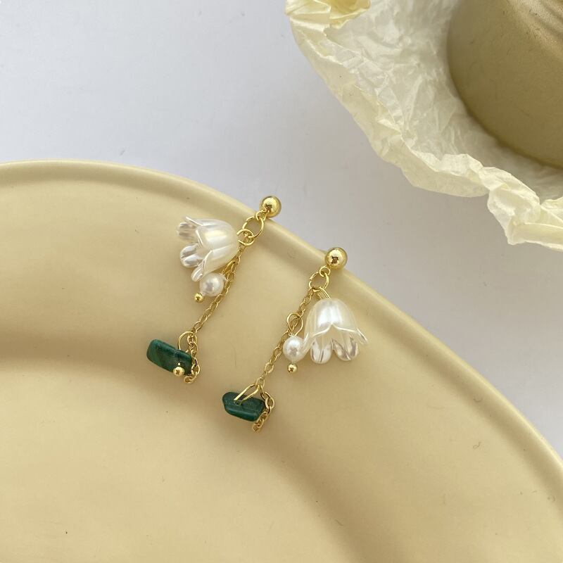 スズランのお花をアレンジしたチャームと、グリーンのマーブルストーンをミックスしたドロップピアスです。ロマンティックなデザインとドロップピアスならではの揺れ感で、フレッシュな雰囲気に仕上がります。コーディネートのアクセントにおすすめのピアスです。