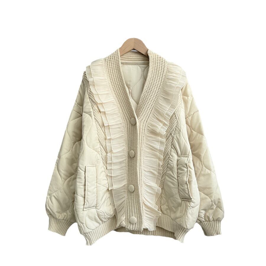 シフォンのワイドフリルがポイントのキルティングジャケットです。内綿入りの暖かいキルティング素材に、袖口と裾、衿まわりのライニングにはニット素材をプラス、保温性も◎です。デニムやスニーカーと合わせてカジュアルに、スカートにヒールのあるシューズを合わせてエレガントにも、お手持ちのアイテムに合わせやすい便利なアウターです。