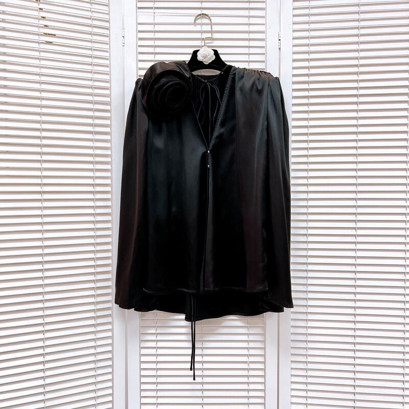 フラワーストリング Vネック サテントップス ブラック CS00094