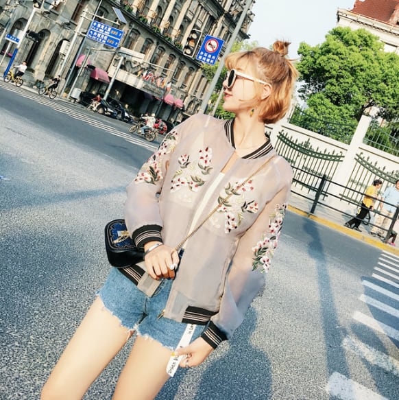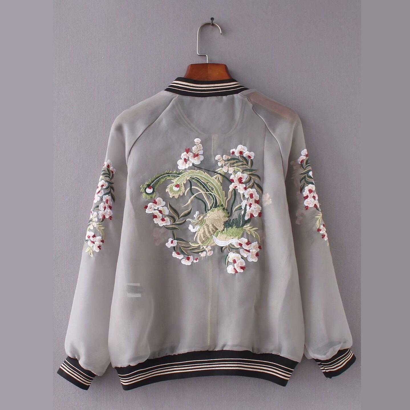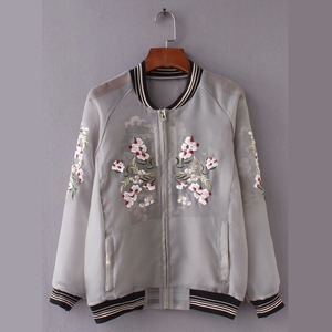 お花と龍の刺繍の入った、シアー素材のスカジャンです。ハイブランドもコレクションに取り入れるなど、世界的に人気が高まっているスカジャンをシアー素材でロマンティックに仕上げた、個性的なデザインです。衿、袖口、裾はモノトーンのリブニットでまとめ、スマートな印象に仕上がっています。ほど良く透け感があり、インナーとのレイヤードが楽しめます。