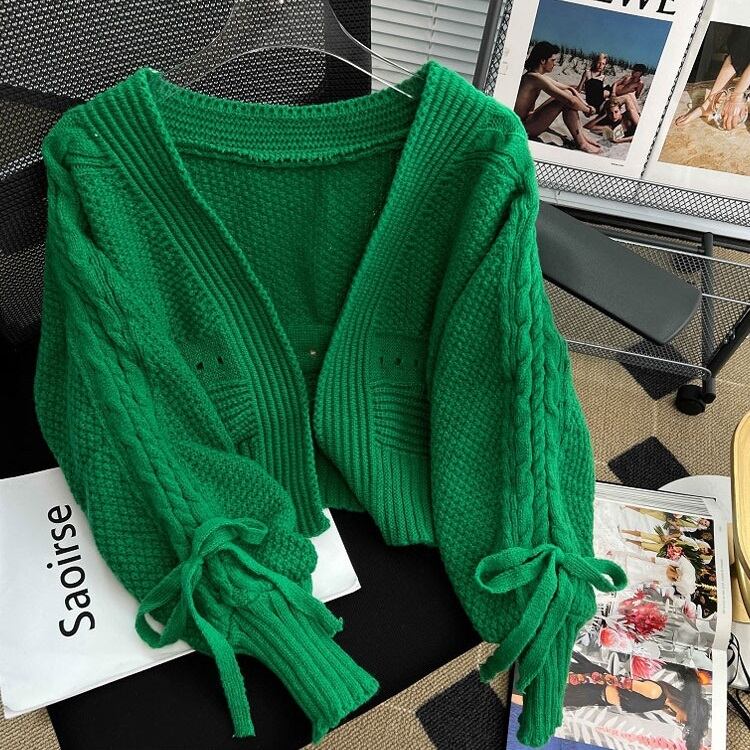 レースアップリボンスリーブ チャンキーニットカーディガン グリーン NI00280