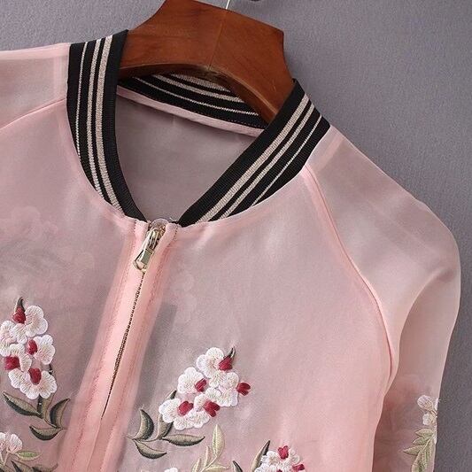 お花と龍の刺繍の入った、シアー素材のスカジャンです。ハイブランドもコレクションに取り入れるなど、世界的に人気が高まっているスカジャンをシアー素材でロマンティックに仕上げた、個性的なデザインです。衿、袖口、裾はモノトーンのリブニットでまとめ、スマートな印象に仕上がっています。ほど良く透け感があり、インナーとのレイヤードが楽しめます。