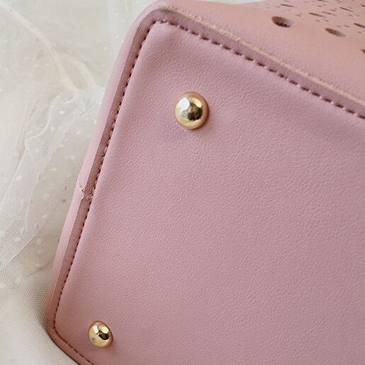 透け感のあるパンチングレースがエレガントなエコレザーのトートバッグです。トートバッグと同じ布地のインナーバッグにショルダーストラップをつければ、ショルダーバッグとして肩掛けをしてお使いいただけます。トートバッグ単体でご使用の場合は、かごバッグのような透け感が楽しめます。
