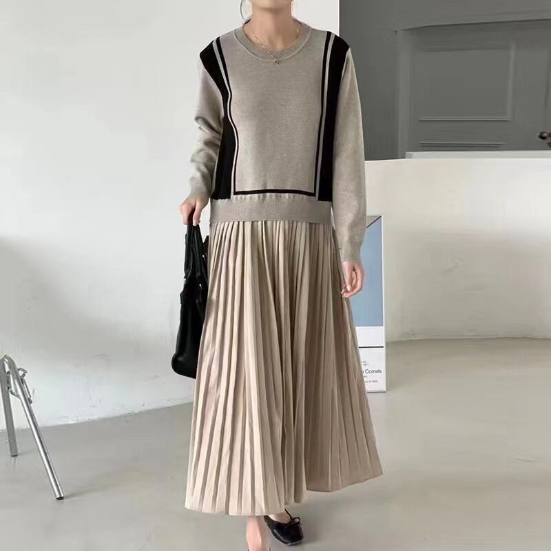 サイドラインニット+プリーツスカート ドッキングワンピース ベージュ OP00194