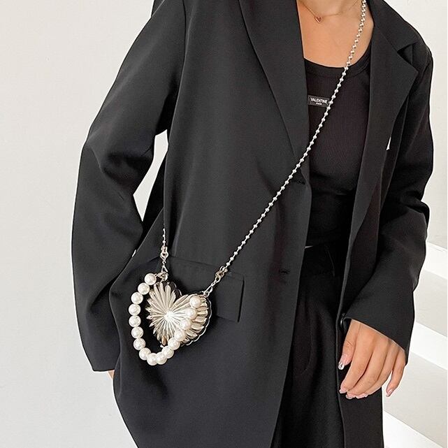 シルバーのハートがスタイリッシュなポシェットです。パールのハンドストラップでハードになりすぎず、フェミニンな印象に仕上がります。ハンドストラップとショルダーストラップを使い分けて、幅広いスタイルのユニークなアクセントとしてお使いいただけます。
