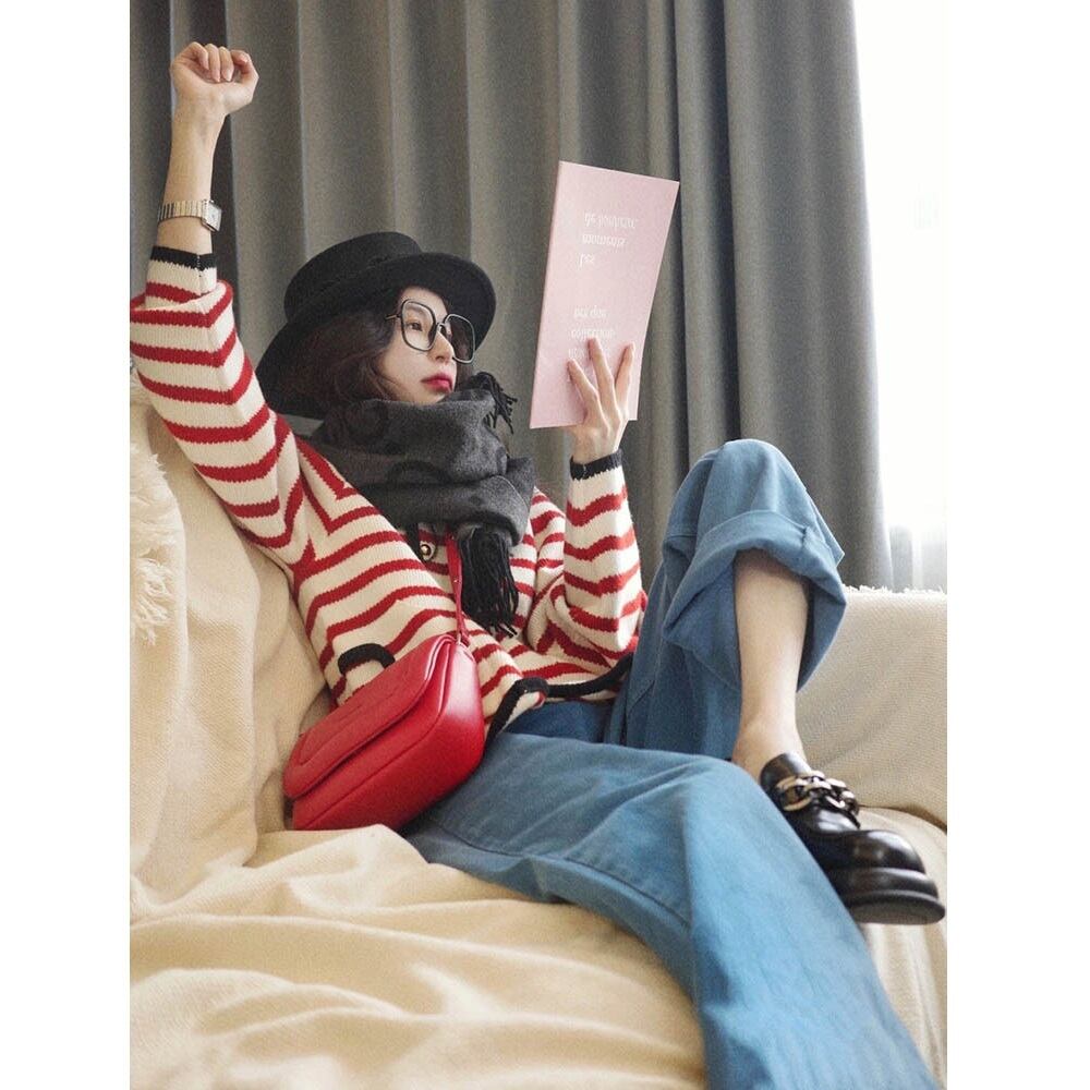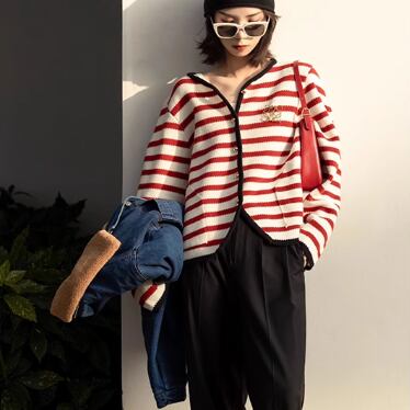 クルーネックのボーダーニットカーディガンです。アイボリー/レッドのボーダーに、ダークカラーのパイピング+ゴールドボタンでスタイリッシュですっきりとしたデザインに仕上がっています。ジャケットとカーディガンの間くらいの使用感が楽しめます。スニーカー+デニムなどカジュアルなコーデにもよく似合います。