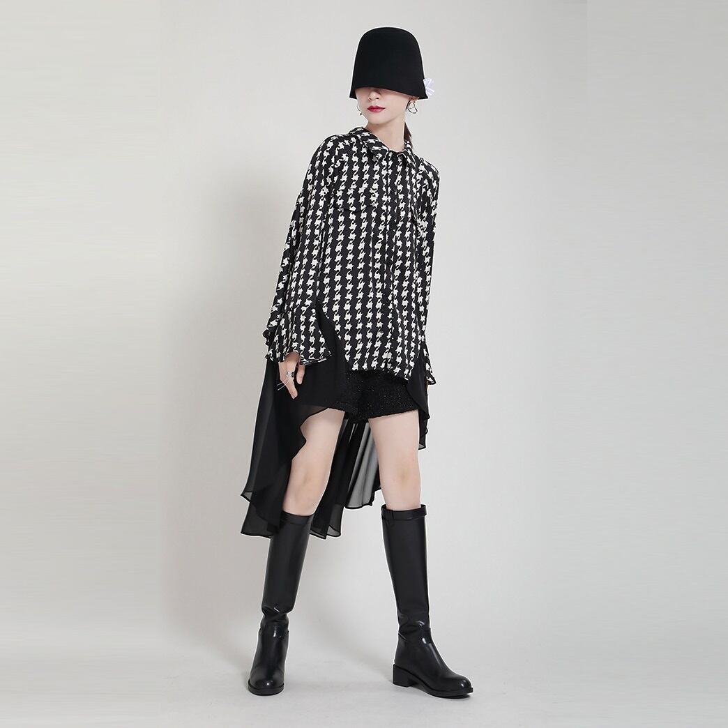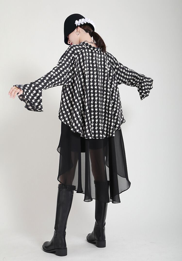 オーガンジーミックス グレンチェック ロングブラウス ブラック BL00091