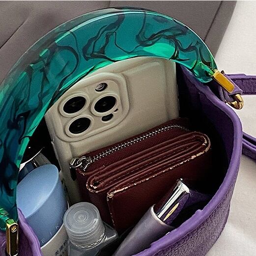 マーブル模様の入った透明のグリーンハンドルがポイントのハンドバッグです。ハンドストラップでハンドバッグ、ショルダーストラップを付けて、ポシェットとして、2通りにお使いいただけます。バッグの底には傷防止のリベットもついており、高級感のあるデザインです。マチが広く、見た目よりも荷物をすっきりと収納できます。