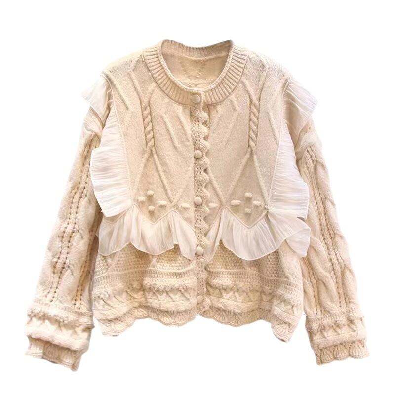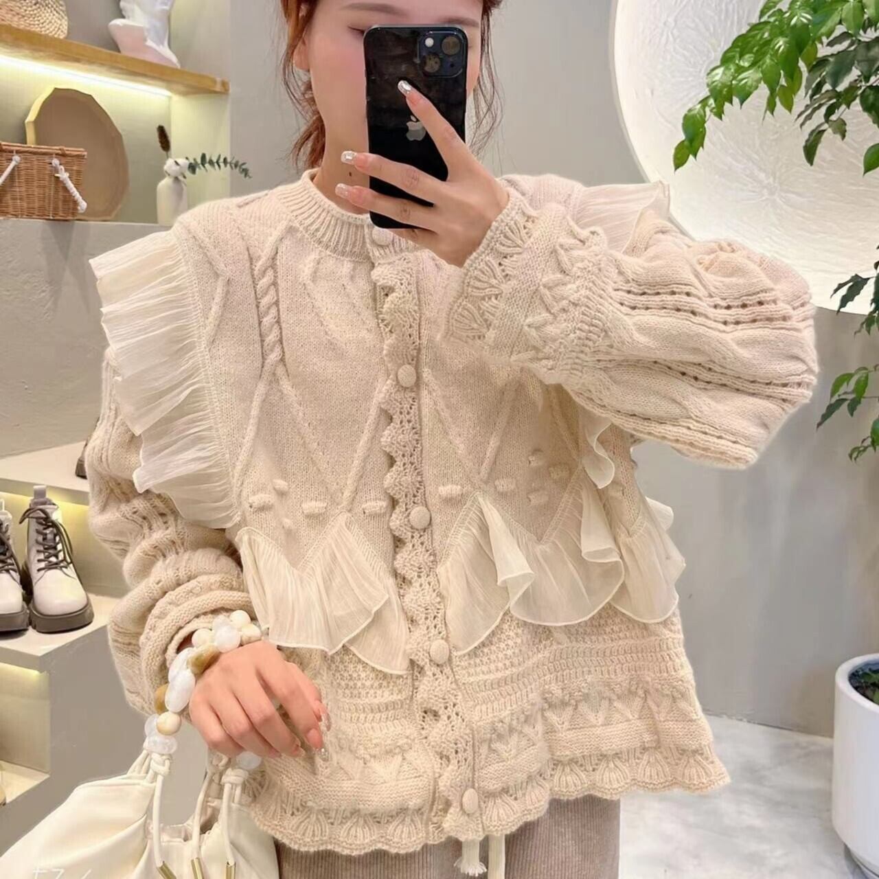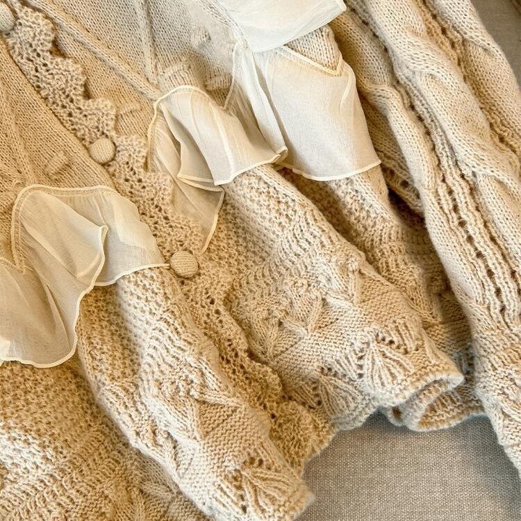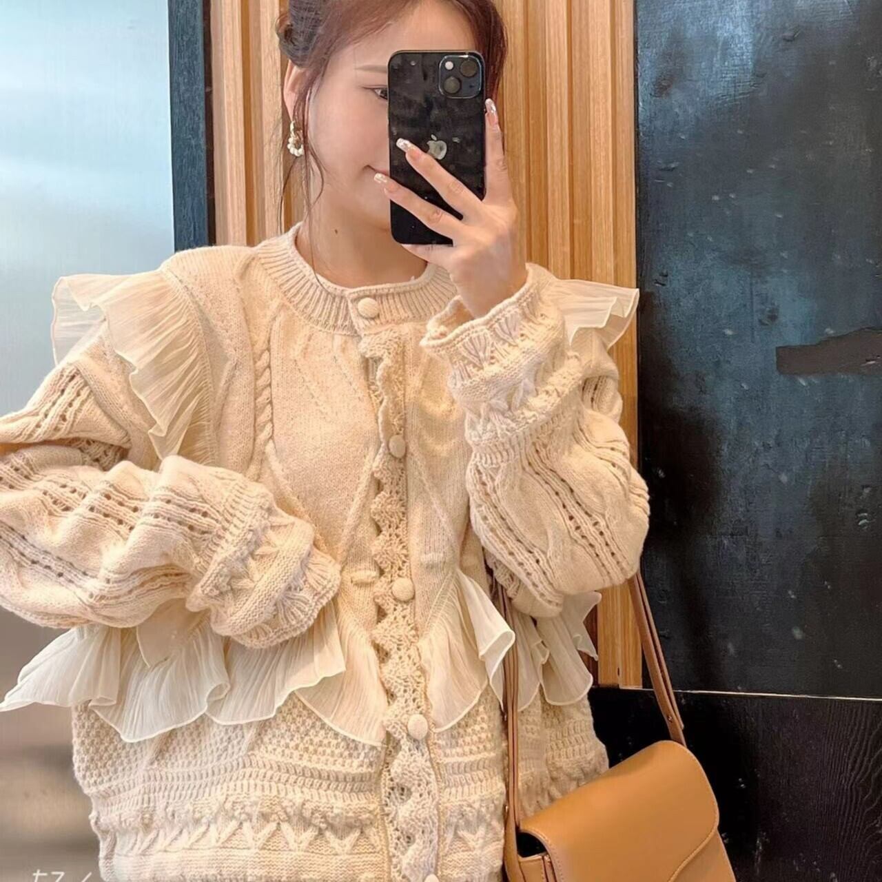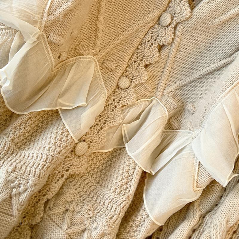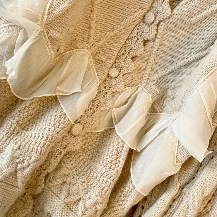 デザイン編みにシフォンのフリルをアレンジしたニットカーディガンです。ベルスリーブや衿のリブ編みなど、細部までこだわったニットモチーフとシフォンのコンビネーションがフェミニンなデザインです。ソフトなアプリコットベージュで、やわらかい雰囲気に仕上がります。デニムとの相性も◎。エレガントなスタイルにもよく似合う、幅広いスタイリングが楽しめるデザインです。