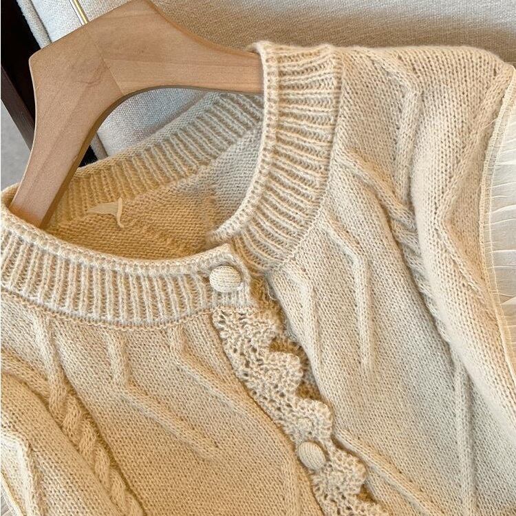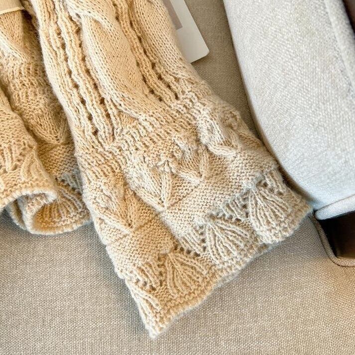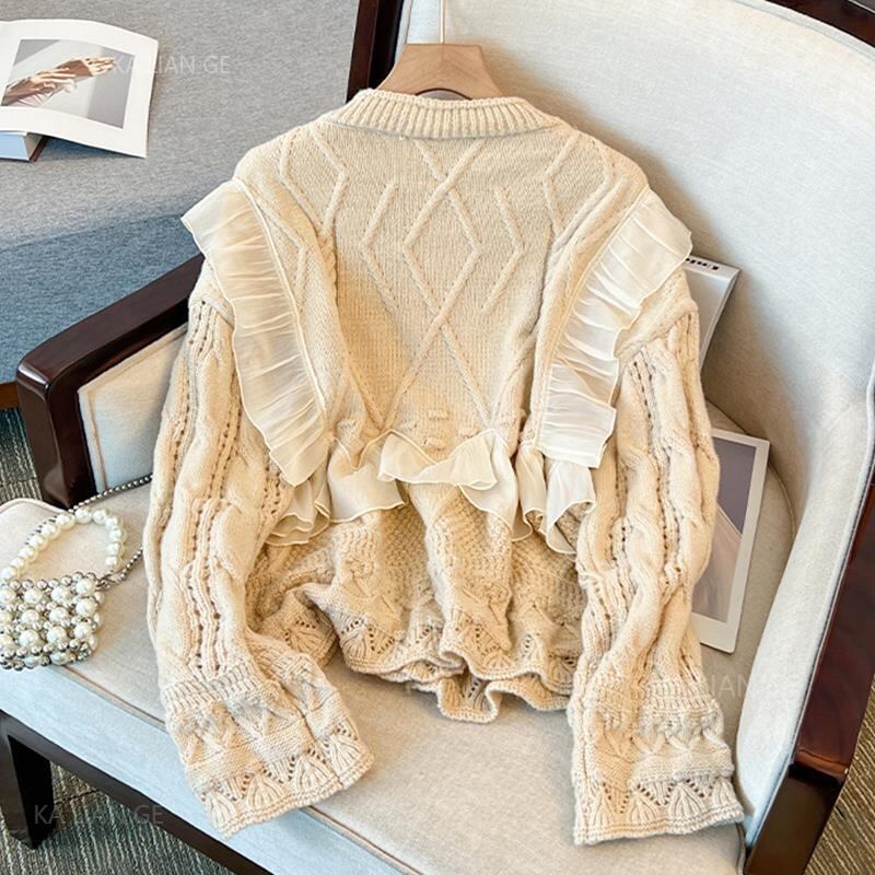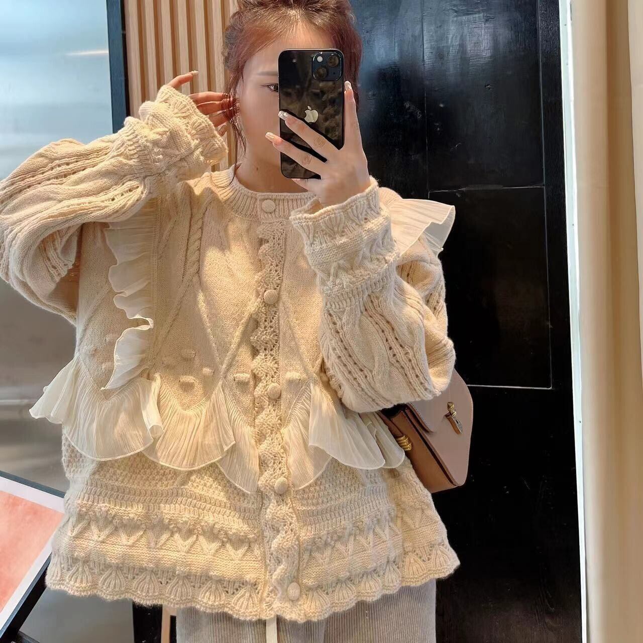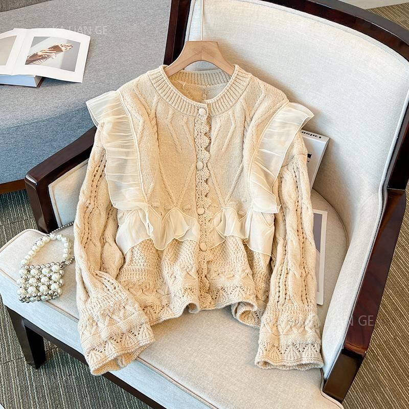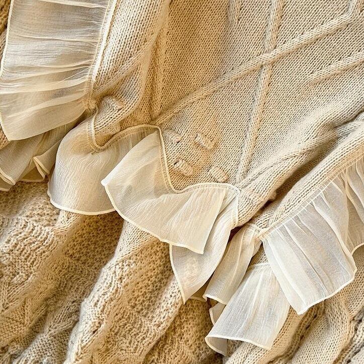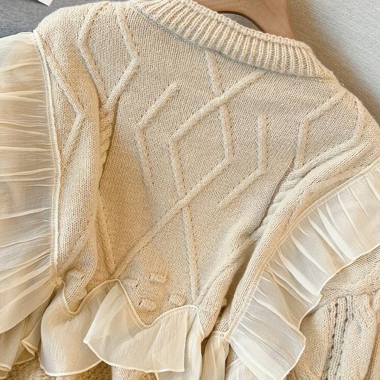 デザイン編みにシフォンのフリルをアレンジしたニットカーディガンです。ベルスリーブや衿のリブ編みなど、細部までこだわったニットモチーフとシフォンのコンビネーションがフェミニンなデザインです。ソフトなアプリコットベージュで、やわらかい雰囲気に仕上がります。デニムとの相性も◎。エレガントなスタイルにもよく似合う、幅広いスタイリングが楽しめるデザインです。