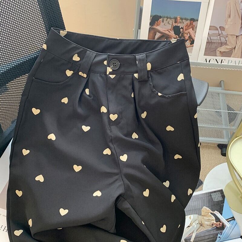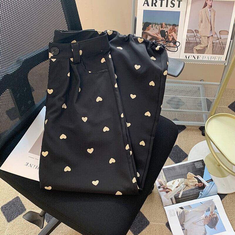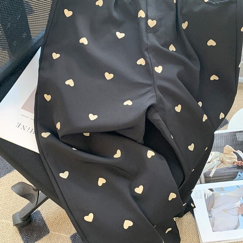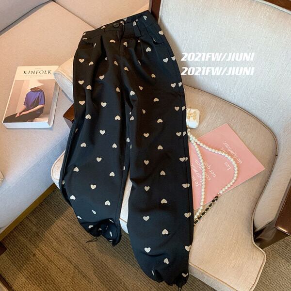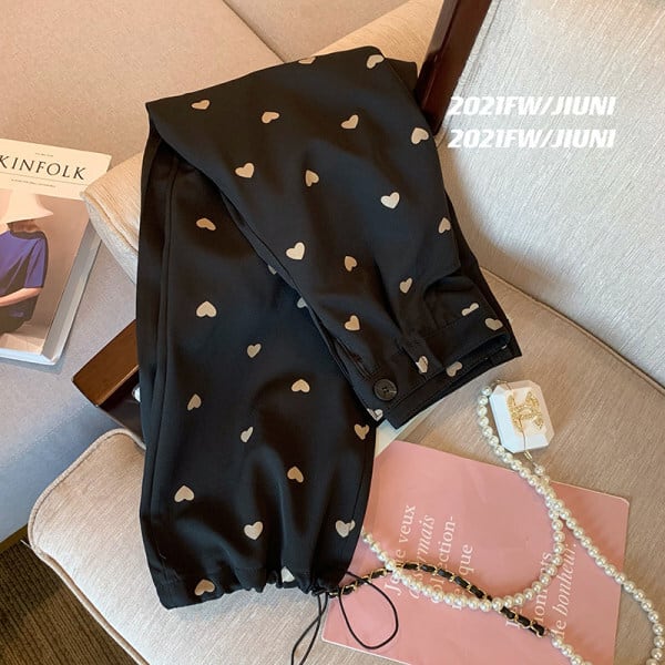 アイボリーのハートが水玉のように入ったフェミニンなデザインのストレートパンツです。タック入りのやわらかいウエストからヒップのシルエットや、すっきりとしたストレートのレッグラインでスタイルアップもでき、女性らしいスタイルに仕上がります。裾にはドローコードが入っており、裾のシルエットや丈もアレンジができます。