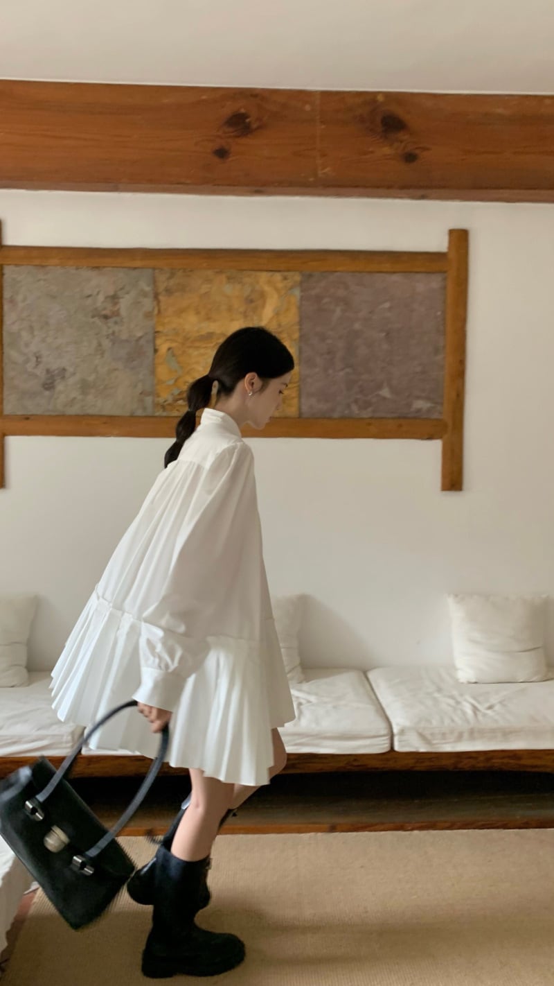 クラシカルな雰囲気のミニ丈のシャツワンピースです。スタンドカラーや裾のプリーツの切替など、細部までエレガントな雰囲気です。下にパンツやスカートを重ねて、ロングシャツとしてレイヤードスタイルが楽しめます。カジュアルなアイテムと合わせても、女性らしさがしっかり残る、フェミニンなデザインです。