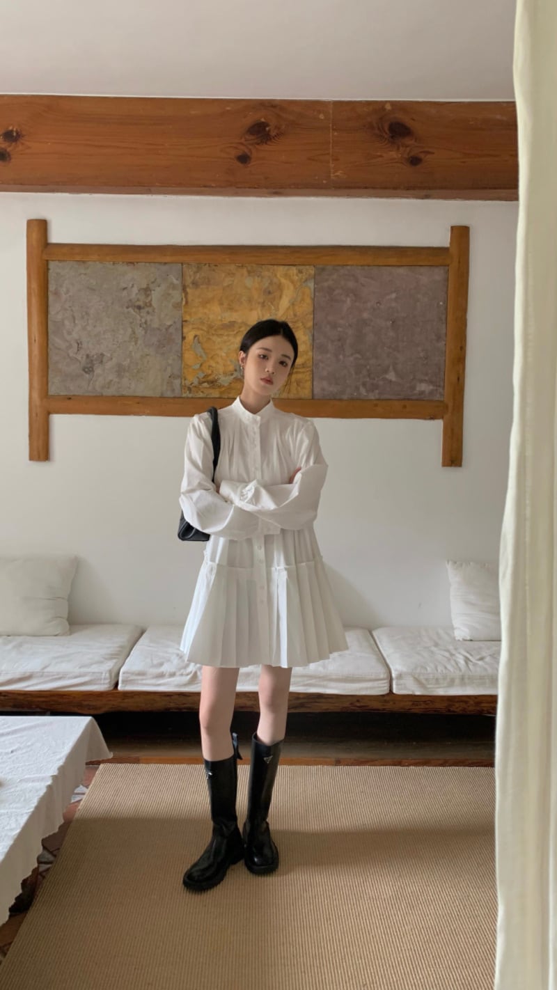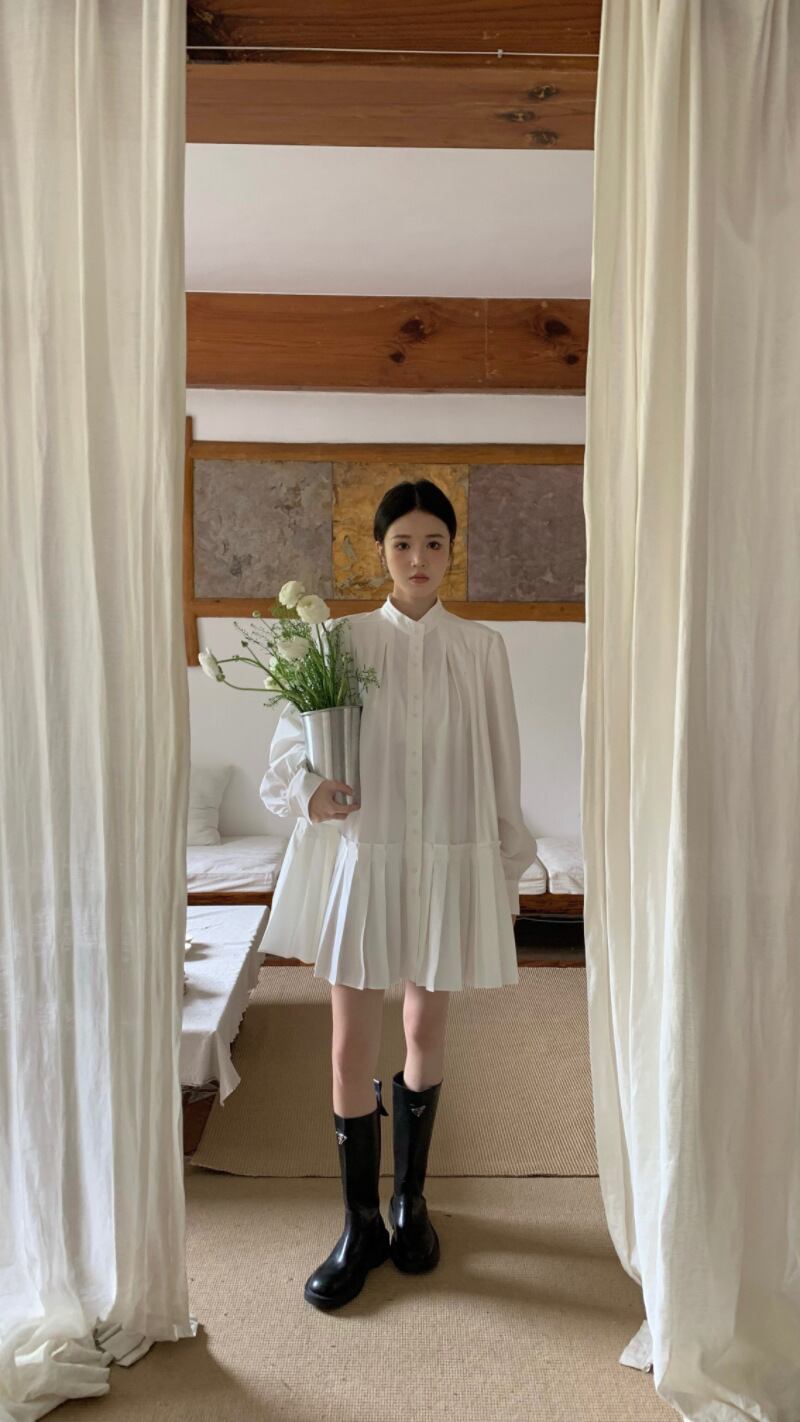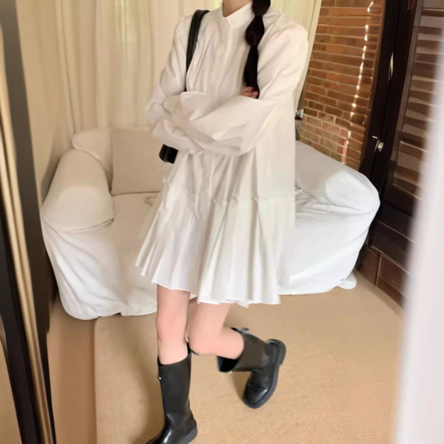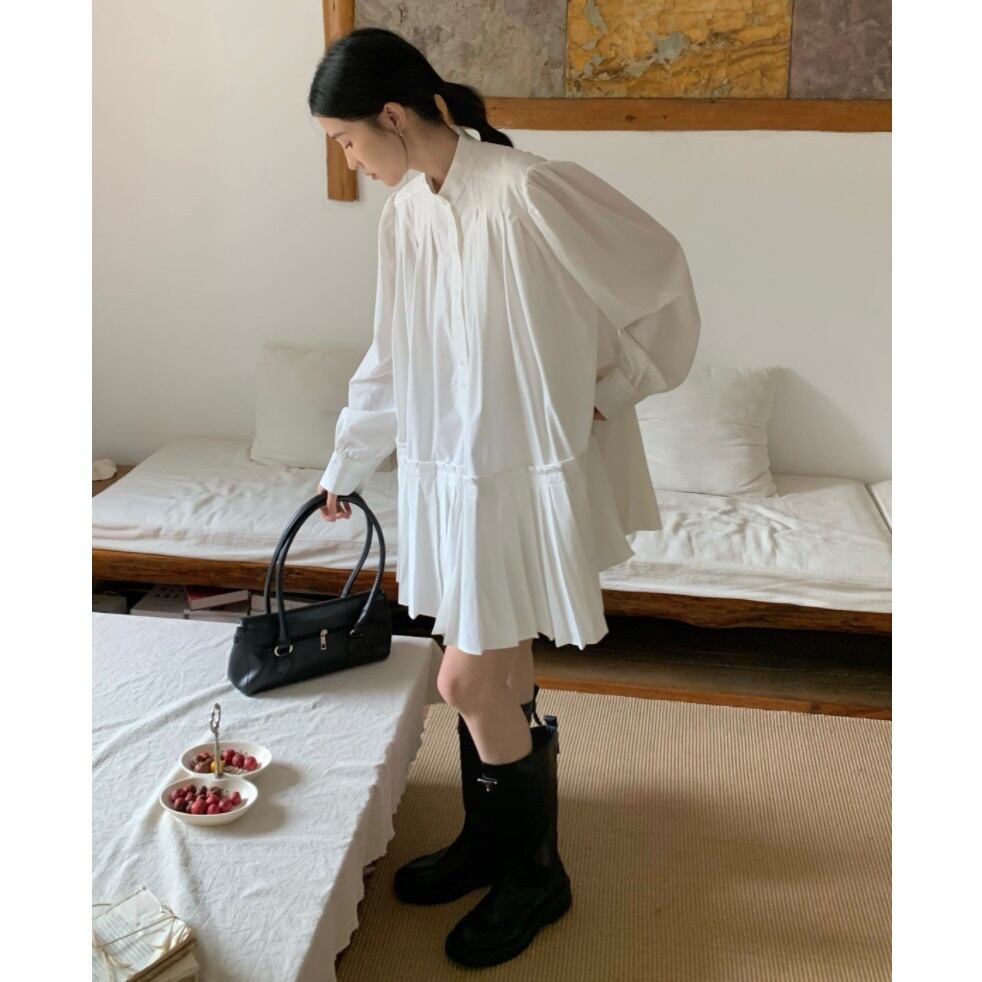 スタンドカラー フリル+プリーツ シャツワンピース ホワイト OP00124