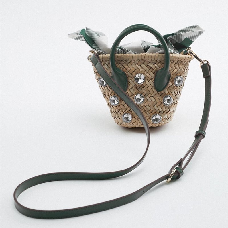 サークルビジューがポイントのかごバッグです。ハンドルのグリーンと内布のギンガムチェックもアクセントになっています。ショルダーストラップをつけてポシェットとして肩掛けもできます。春夏のスタイリングのアクセントにおすすめのバッグです。
