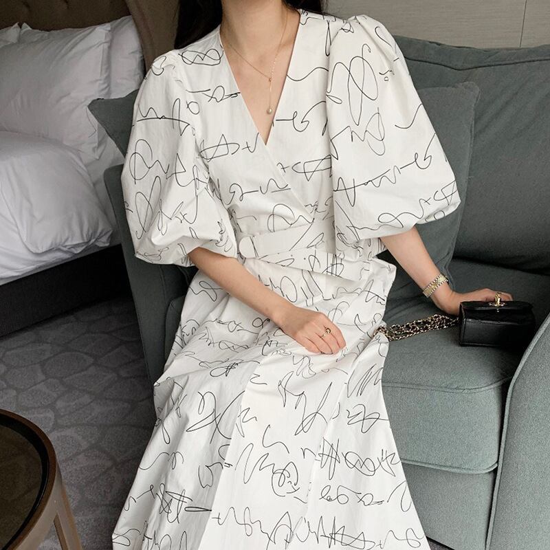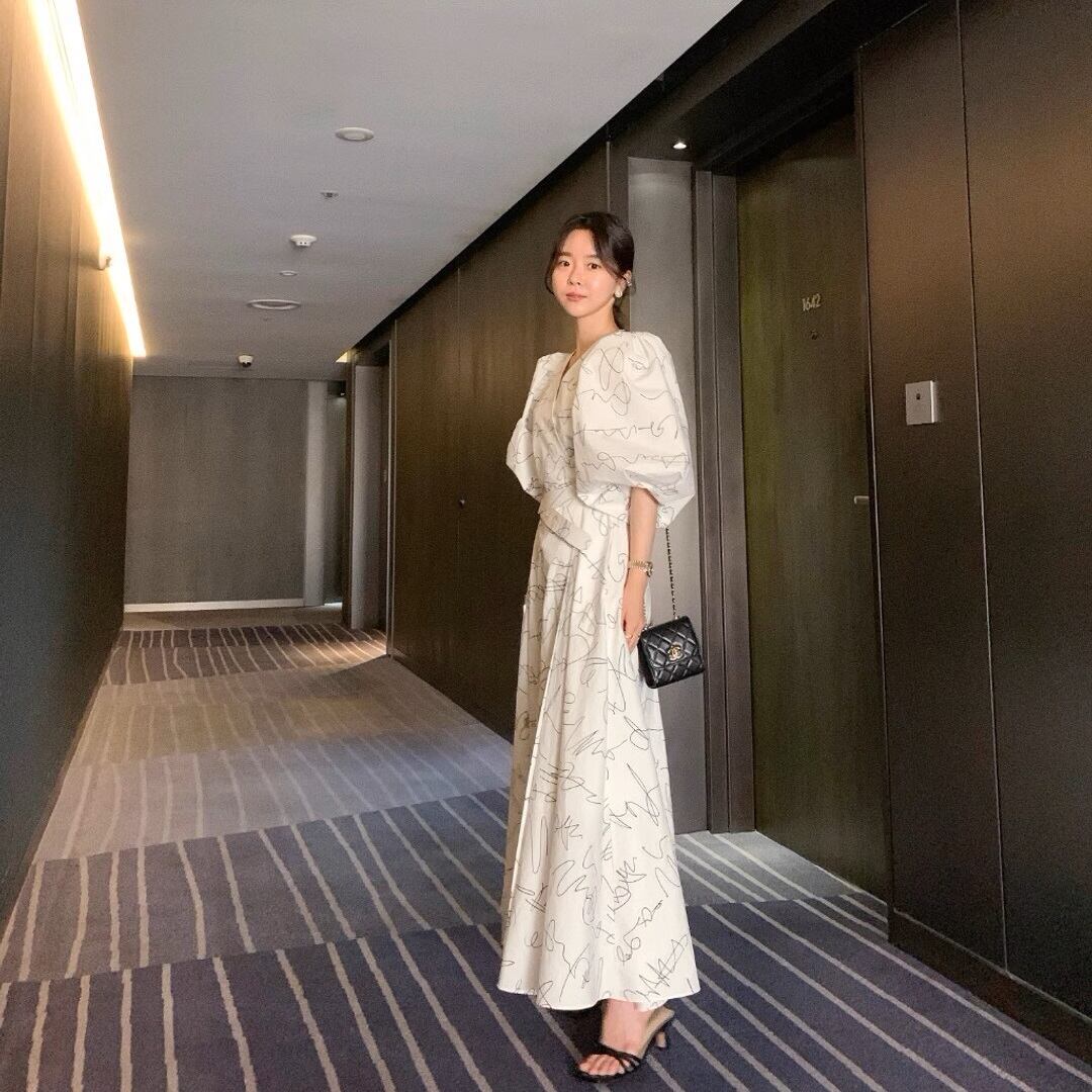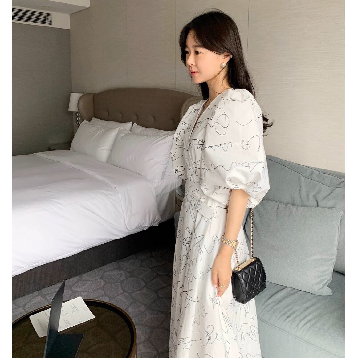 遊び心のあるレタリングプリントとエレガントなシルエットがポイントのロング丈ワンピースです。ボリュームのあるランタンスリーブとVネック、美しいフレアのシルエットで、スタイルアップが叶います。1枚でさらっと着れて、存在感のあるスタイルが完成します。