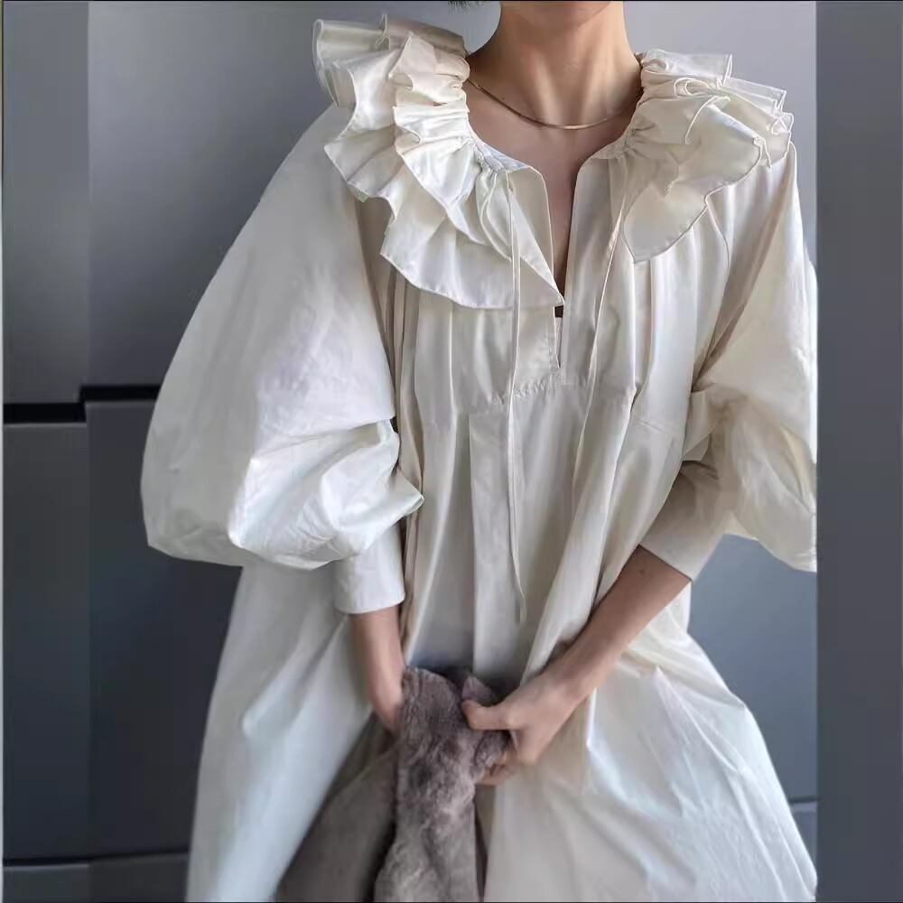 ランタンスリーブと衿のフリルがロマンティックなロング丈のワンピースです。ボリュームのあるランタンスリーブと衿のフリル、美しいフレアのシルエットでスタイルアップが叶います。1枚でさらっと着れて、存在感のあるスタイルが完成します。