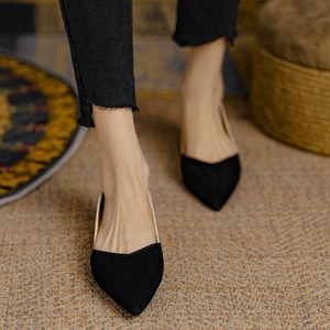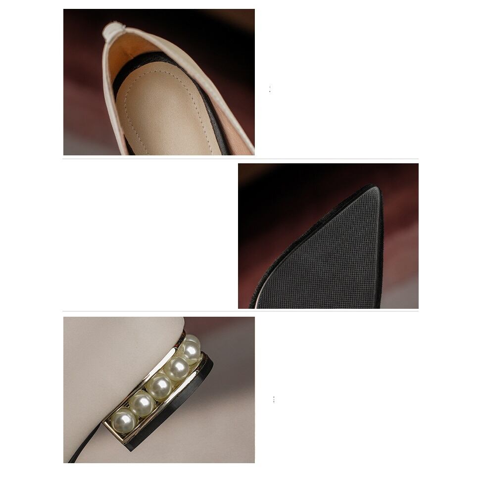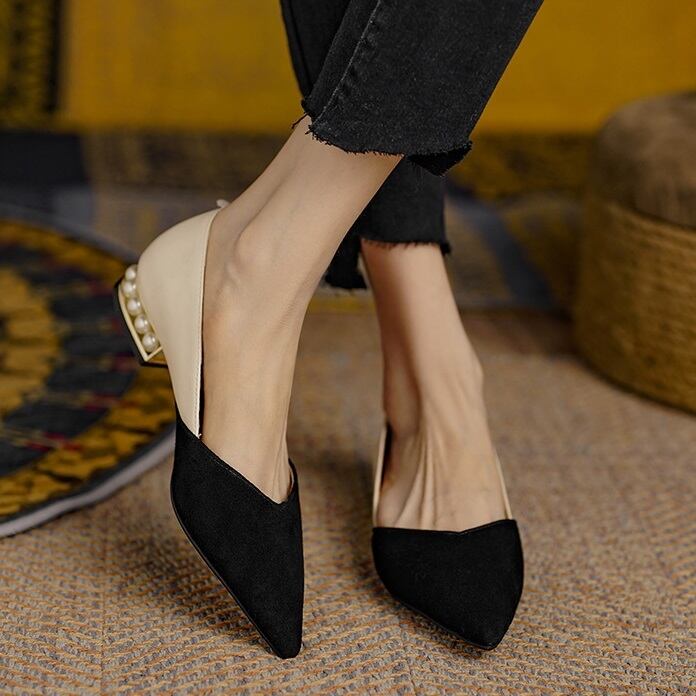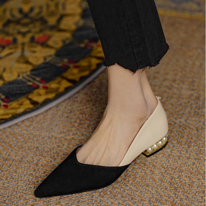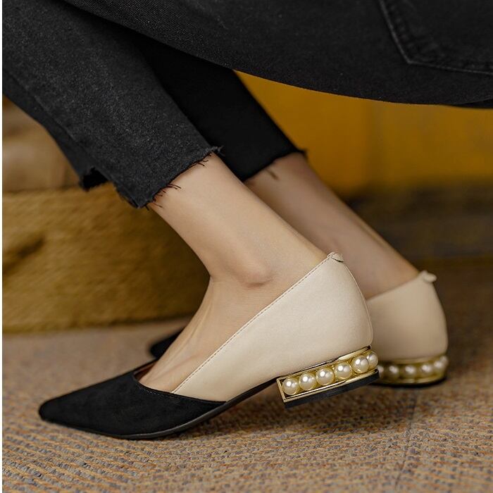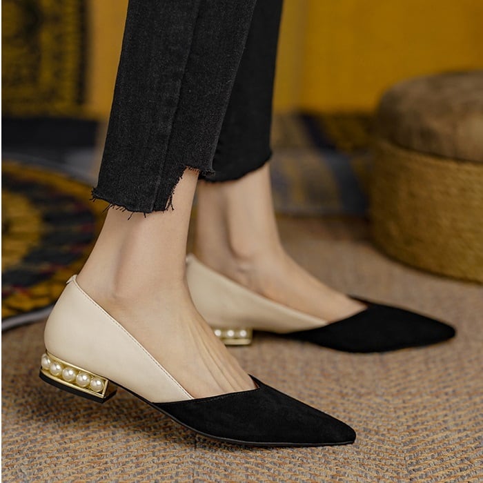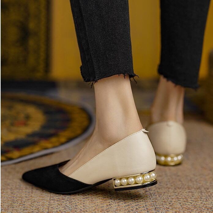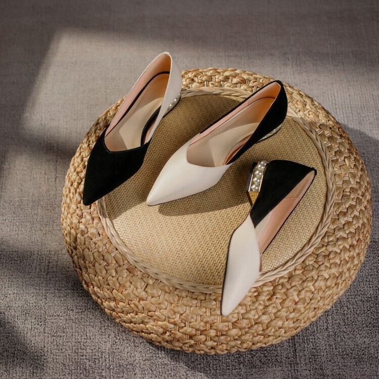 ヒールの大粒パールデコレーションとバイカラーがエレガントなレザーフラットパンプスです。脚にフィットするソフトなレザーを使用し、低めの3cmヒールで歩きやすさも◎です。ドレッシーなスタイルはもちろん、カジュアルなデニムスタイルもエレガントな雰囲気に仕上がります。
