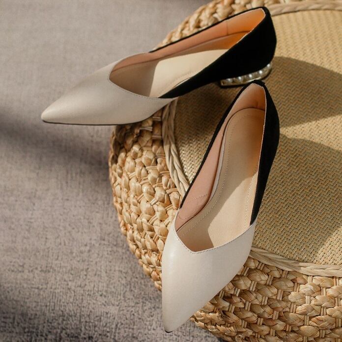 ヒールの大粒パールデコレーションとバイカラーがエレガントなレザーフラットパンプスです。脚にフィットするソフトなレザーを使用し、低めの3cmヒールで歩きやすさも◎です。ドレッシーなスタイルはもちろん、カジュアルなデニムスタイルもエレガントな雰囲気に仕上がります。