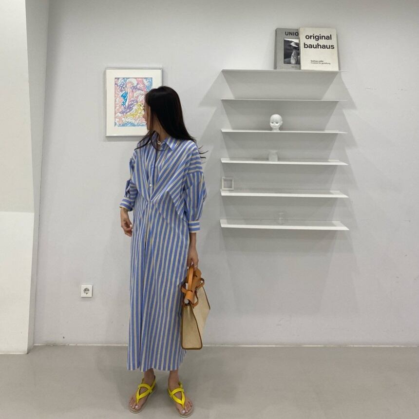 ウエストのタックがポイントのストライプのシャツワンピースです。ウエストに入ったタックでストライプが斜めにチェンジ、シルエットとデザインのユニークなメリハリがうまれるスタイリッシュなデザインです。ロング丈のシャツとして、パンツやスカートとのレイヤードも楽しめます。インナーの心配もなく、1枚でさらっと着こなせる、フレッシュで着心地の良いワンピースです。