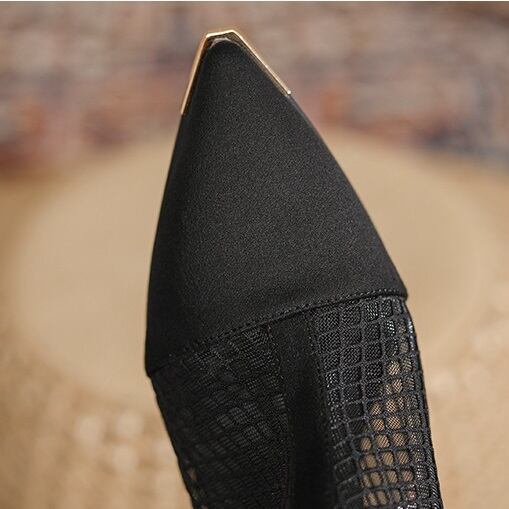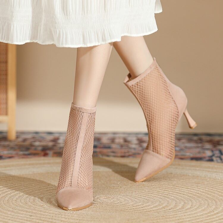 ゴールドのポインテッドトゥがポイントのメッシュのショートブーツです。つま先と踵のエコレザーとメッシュ素材のコンビネーションがエレガント。上品な透け感が楽しめるユニークなデザインです。タイツやストッキングとレイヤードしたり、幅広いスタイリングができ、コーデの幅が広がります。