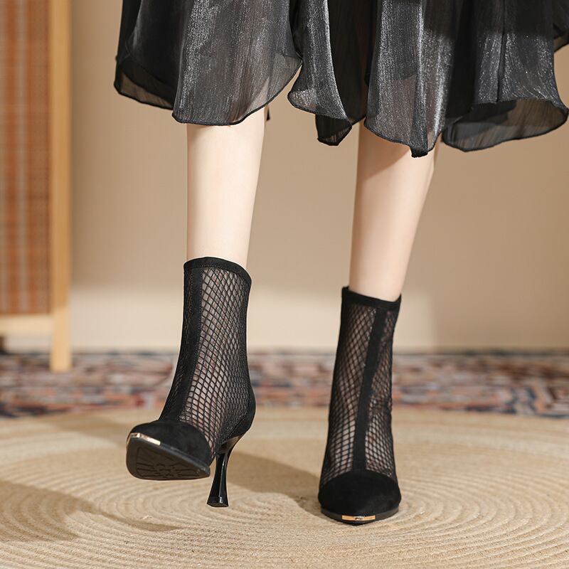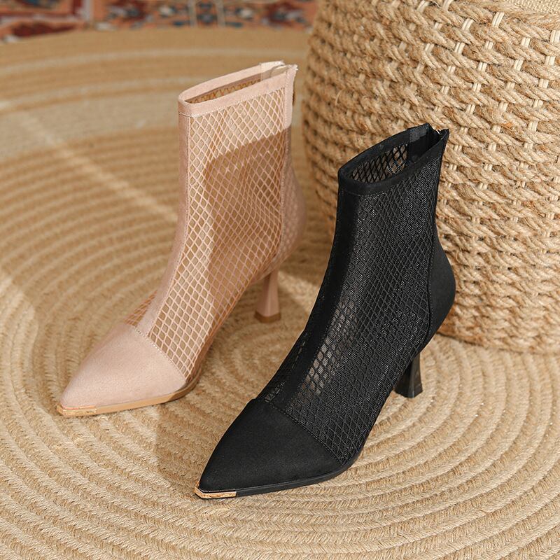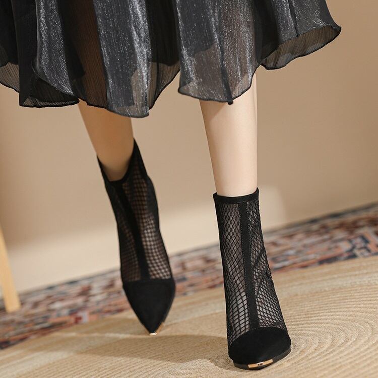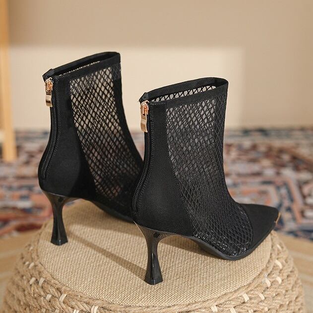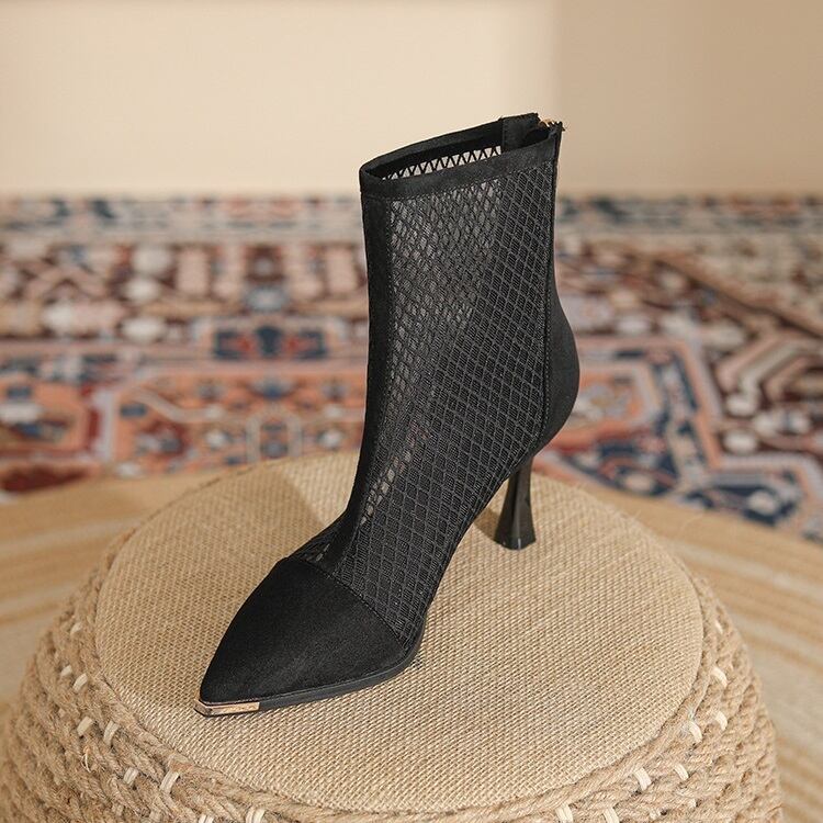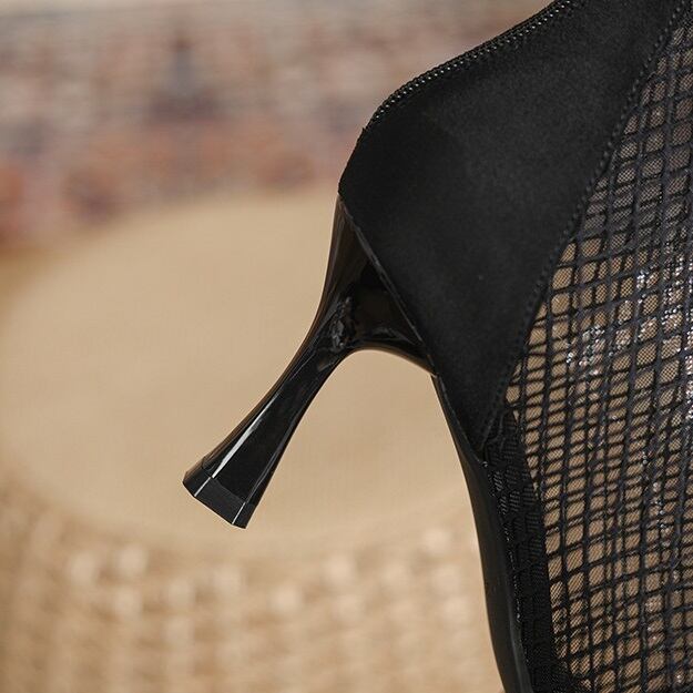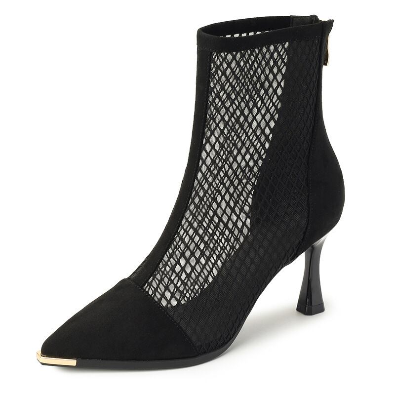 ゴールドのポインテッドトゥがポイントのメッシュのショートブーツです。つま先と踵のエコレザーとメッシュ素材のコンビネーションがエレガント。上品な透け感が楽しめるユニークなデザインです。タイツやストッキングとレイヤードしたり、幅広いスタイリングができ、コーデの幅が広がります。