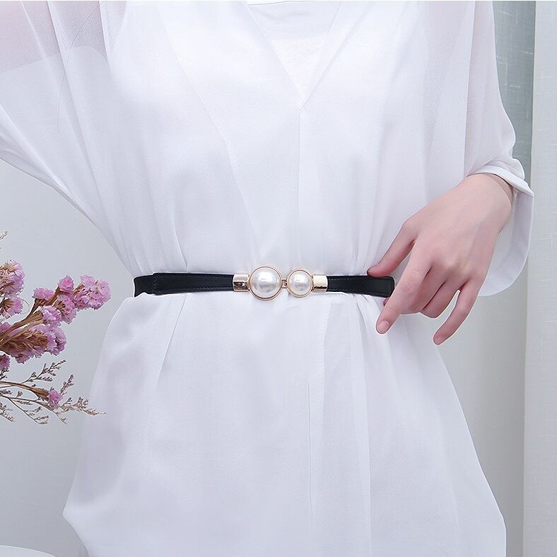 フロントのダブルパールがポイントのエコレザーと伸縮性のあるゴムのコンビベルトです。お好きな位置でフックで留めるタイプの新しいベルトです。スタイルに合わせてパールの見せ方をチェンジできます。ジャケット、シャツ、ワンピースなどのウエストマークにおすすめです。