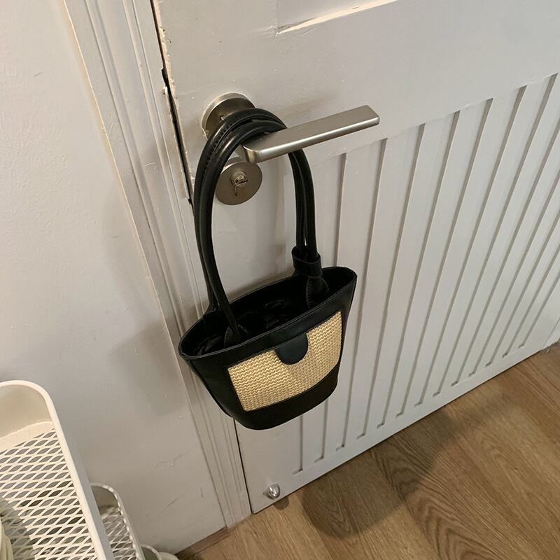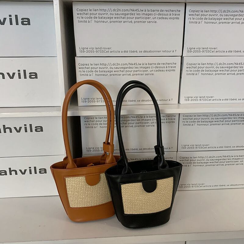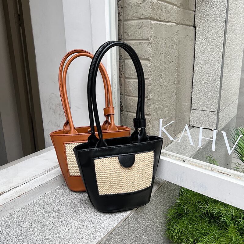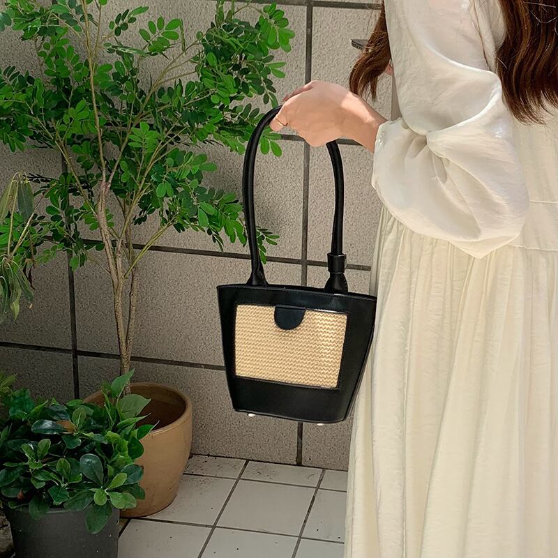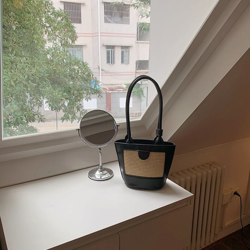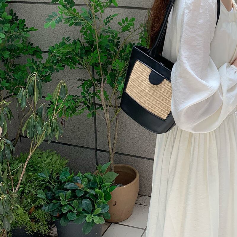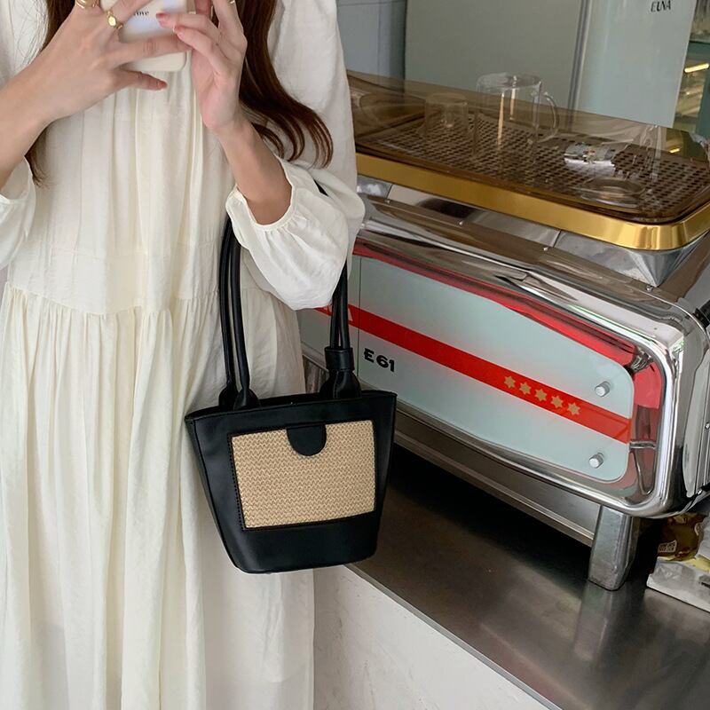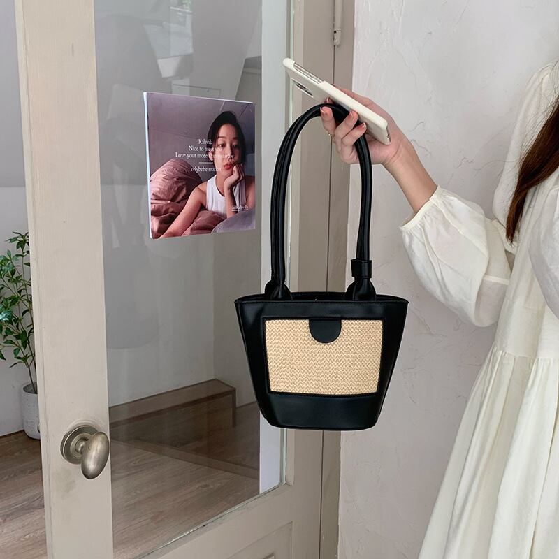 ストロー素材のフロントパネルがポイントのエコレザーのミニトートバッグです。ストロー素材とエコレザーの異素材ミックスとロングハンドルがスタイリッシュ。ハンドストラップをまとめるバンドや底のリベットなど、細部までこだわりのデザインです。マチも広く、見た目よりすっきりと荷物を収納できます。軽くやわらかく、お手入れのしやすいエコレザーです。