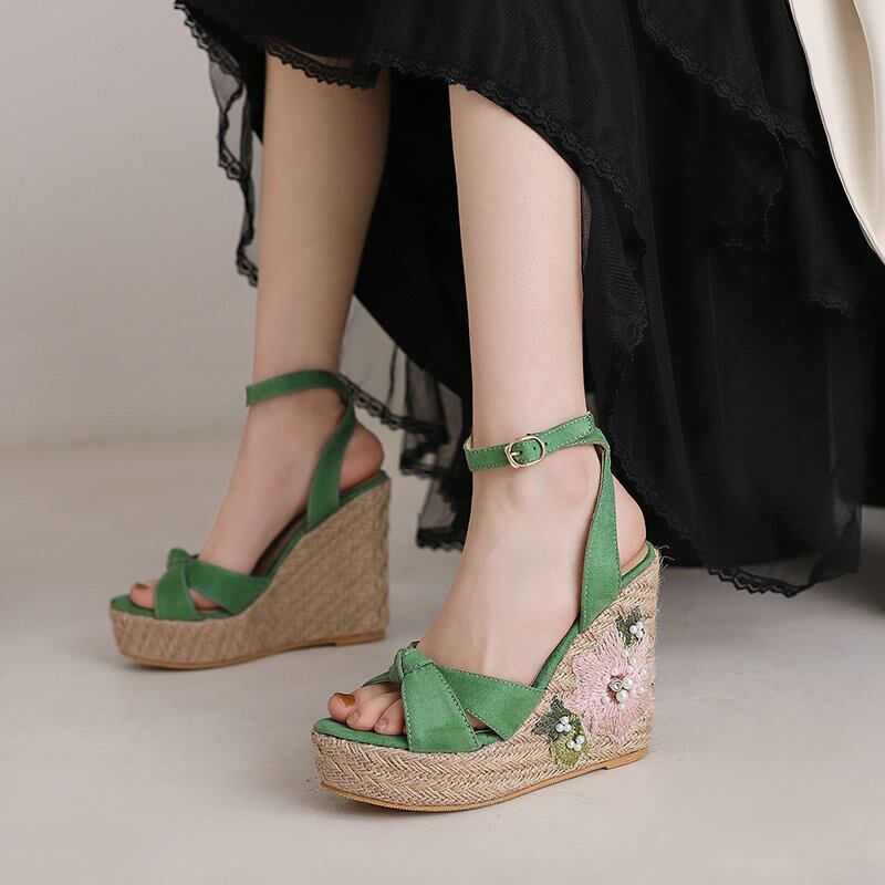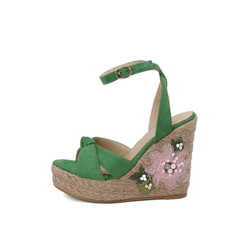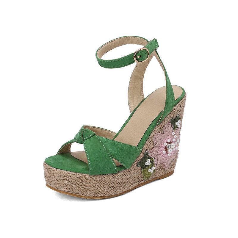 フラワーウェッジソール アンクルストラップサンダル グリーン SH00208
