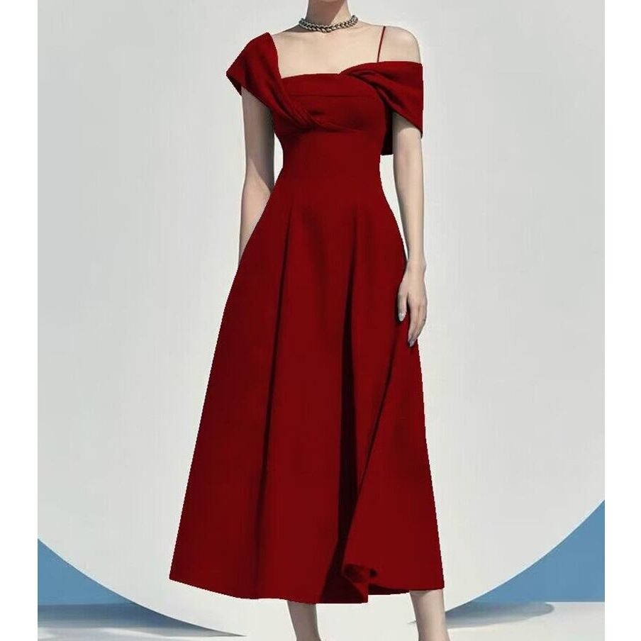 アシンメトリーなストラップがポイントのエレガントなフレアワンピースです。メリハリのある上品なシルエットと高級感のあるブリックレッドで、エレガントで印象的な雰囲気に仕上がります。春夏のお出かけが楽しくなる、存在感のあるワンピースです。