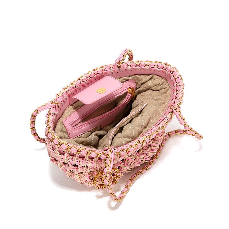 ブレイドレザーチェーンがエレガントなストローバッグです。ピンクのストロー素材とブレイドレザーチェーンがユニーク、ノーマルのかごバッグよりもラグジュアリーな雰囲気に仕上がります。ポケットやマグネットボタン、チャームもついて、細部までこだわりのデザインです。春夏のスタイリングのアクセントにおすすめです!