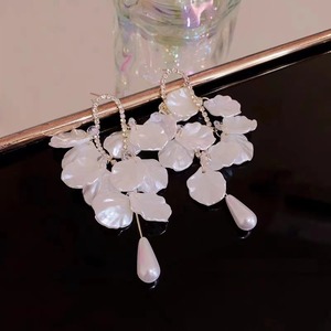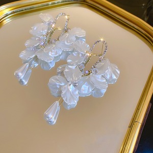 ガラスパールのお花とラインストーンがエレガントなドロップピアスです。大ぶりなデザインとガラスパールの輝き、ドロップピアスの揺れ感で、顔まわりを明るく、華やかにみせてくれます。シンプルなコーデがぐっと引き立つ、エレガントなピアスです。