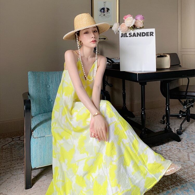 アブストラクトプリント キャミソールワンピース ホワイト/レモンイエロー OP00217