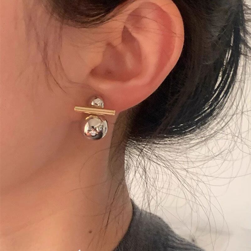 シルバーボールとゴールドバーをアレンジしたスタッズピアスです。ゴールドとシルバーのコンビネーションがスタイリッシュ。カジュアル、ドレッシーなスタイルはもちろん、マニッシュなスーツコーデなどにもよく似合います。