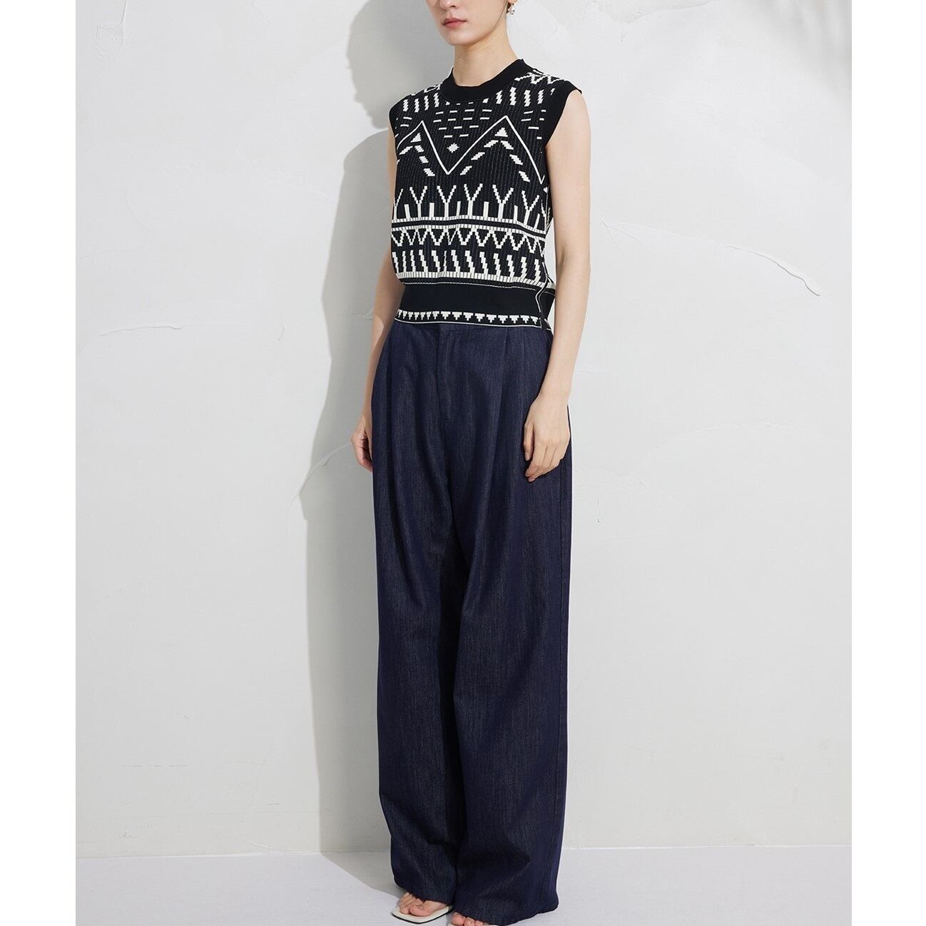 ジオメトリックモチーフがスタイリッシュなノースリーブニットです。下にブラウスやTシャツを重ねたり、ジャケットのインナーにしたり、幅広いスタイリングが楽しめます。ボトムスを選ばず、1年を通して幅広いスタイリングが楽しめます。