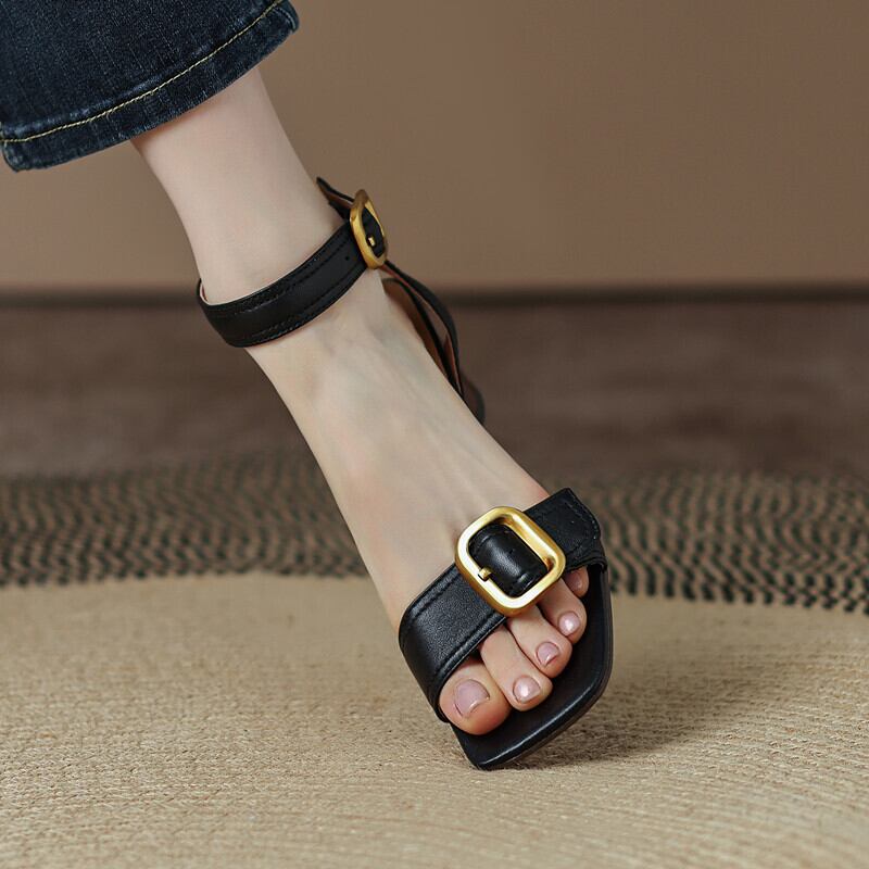 マットゴールドのスクエアチャームがポイントのエレガントなアンクルストラップヒールサンダルです。アンクルストラップと安定感のあるヒールで歩きやすさも◎。デニムなどカジュアルなコーデにも、エレガントなスタイルにも、幅広いスタイルにフィットする春夏におすすめのヒールサンダルです。大きいサイズ、小さいサイズ対応アイテムです。