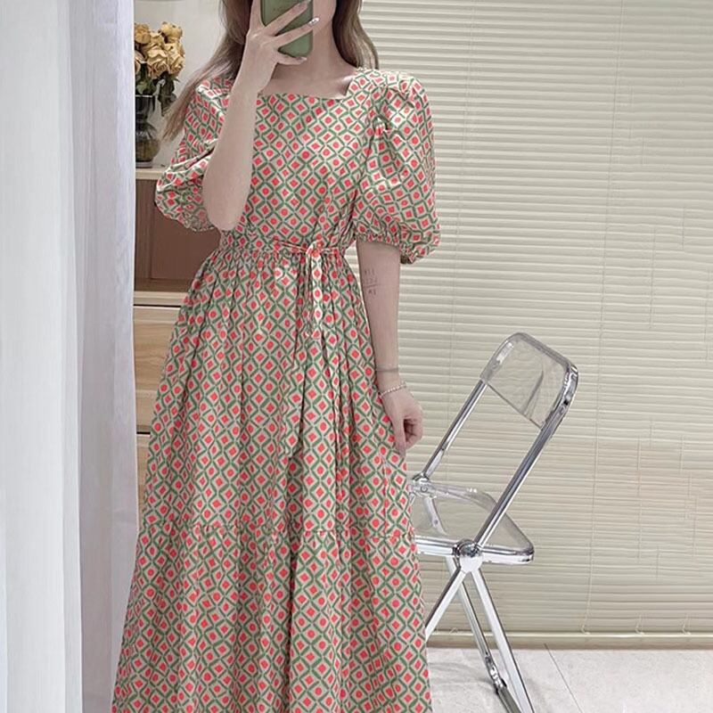さわやかなカラーリングがポイントのジオメトリックプリントのワンピースです。スウエアネックやランタンスリーブ、ウエストベルトなど、メリハリのあるシルエットで、スタイルアップが叶います。1枚で春夏にぴったりの印象的なスタイルが完成します。