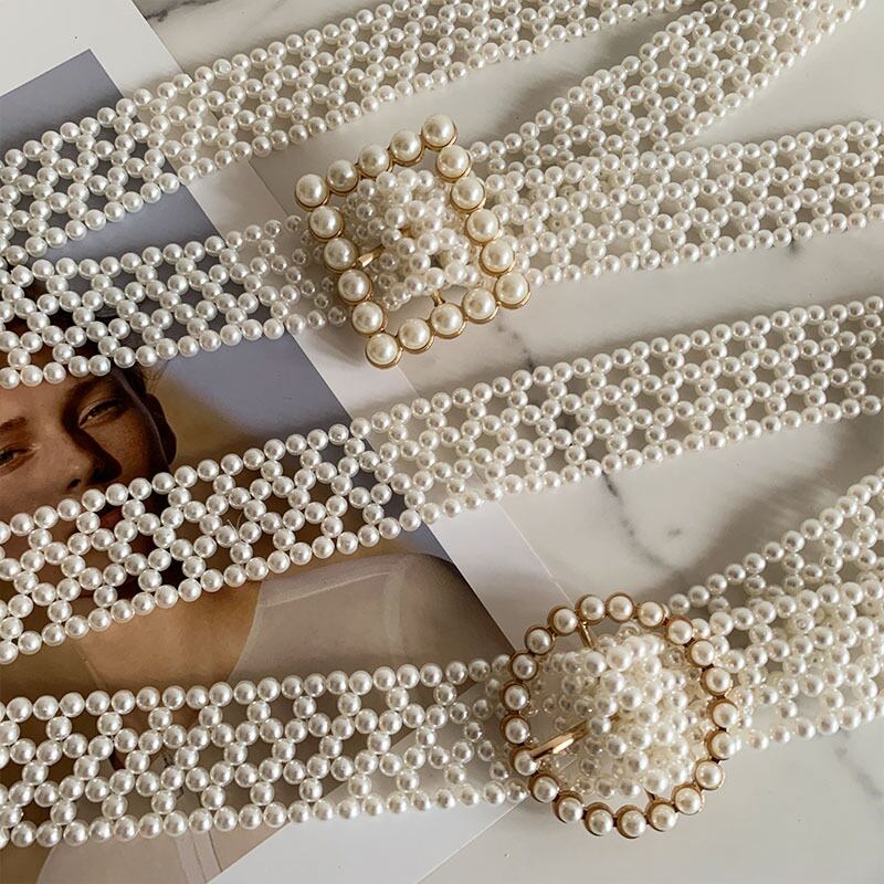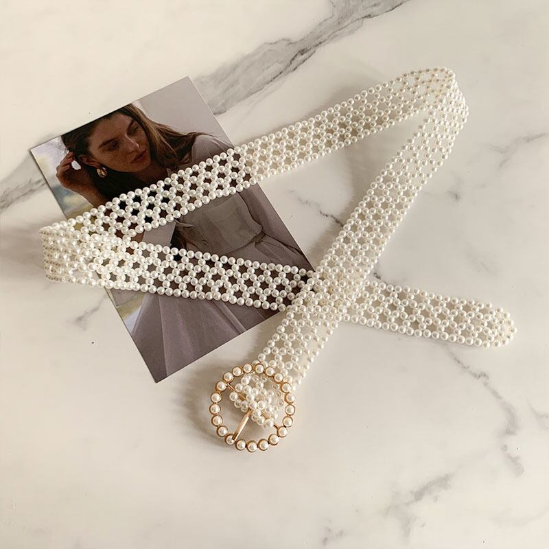 バックルもベルトもパールでデコレーションしたベルトです。サークルのバックルでスイート、かつエレガントな雰囲気に仕上がります。ジャケット、シャツ、ワンピースなどのウエストマークにおすすめです。