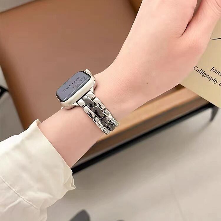 2色のメタルバンドのコンビがスタイリッシュな、Apple Watchバンドです。女性の手首にフィットするスリムベルトと通勤にも使えるシンプルなデザインで、スマートウォッチを上品にスタイリングできます。ブレスレット感覚でベルトも着け替えたくなるデザインです。