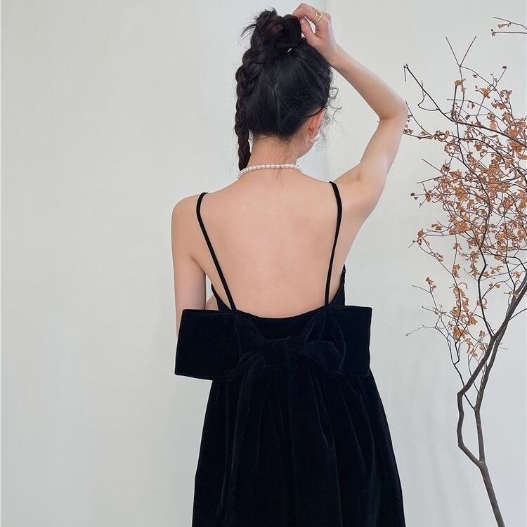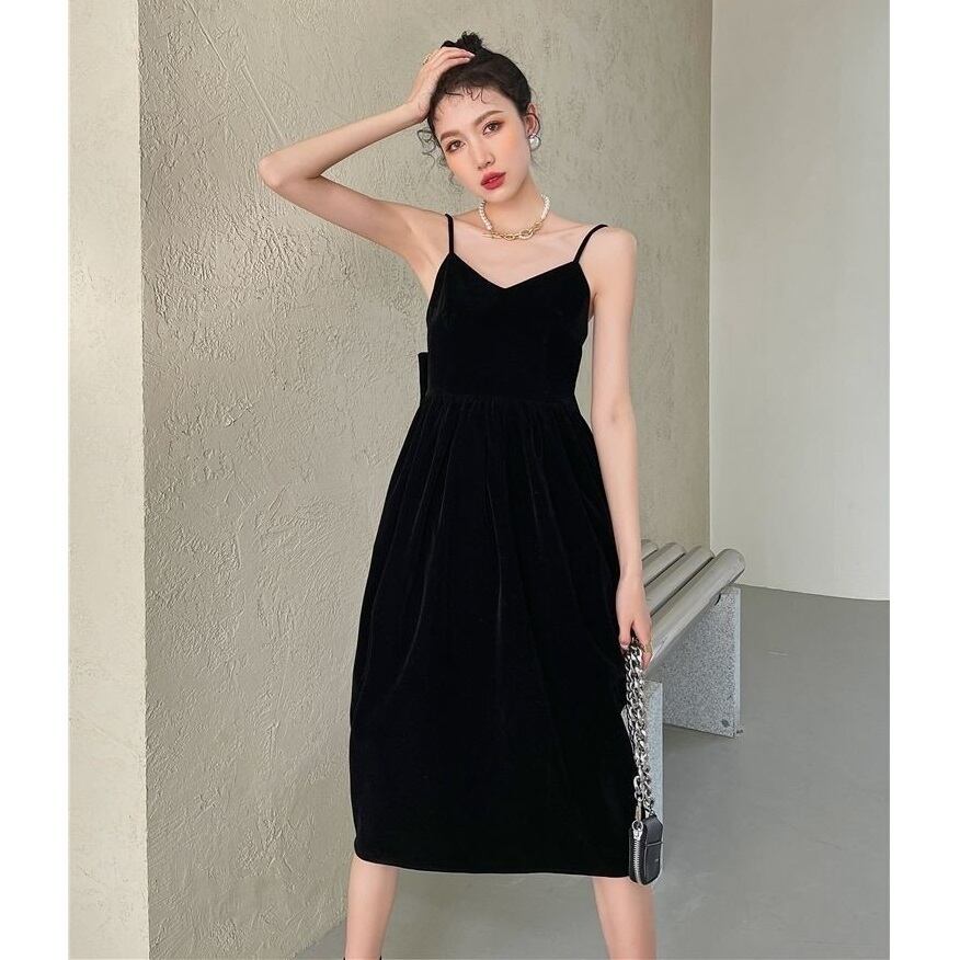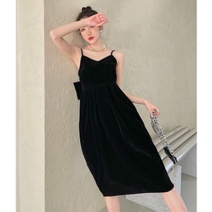 バックリボンがエレガントなベルベットのキャミワンピースです。インナーにシアートップスやブラウス、Tシャツ、ニットを重ねたり、ジャケットを羽織ったり、ブーツでもサンダルでも、幅広いアイテムとのコーディネートが楽しめるアイテムです。1年を通して、スタイリングを考えるのが楽しくなるキュートなデザインのワンピースです。