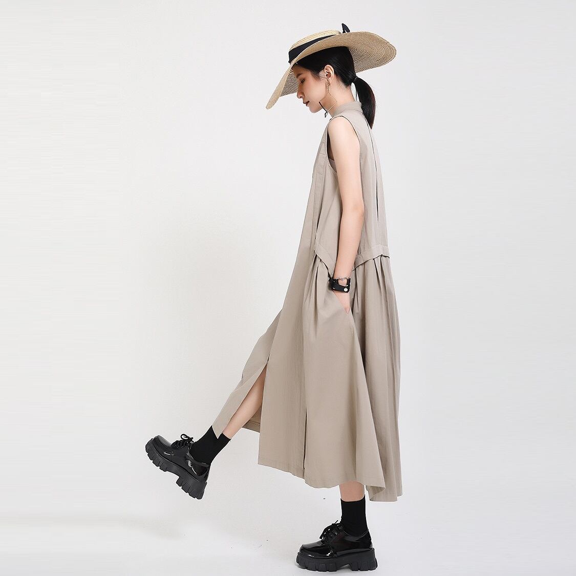 スタンドカラー バックプリーツ ノースリーブワンピース ダークベージュ OP00232