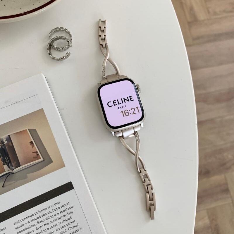 ブレスレットのようなジルコニア入りのApple Watchバンドです。エレガントなマットなホワイトゴールドとロマンティックなデザインで、スマートウォッチを上品にスタイリングできます。ブレスレット感覚でベルトも着け替えたくなる、オシャレなデザインです。