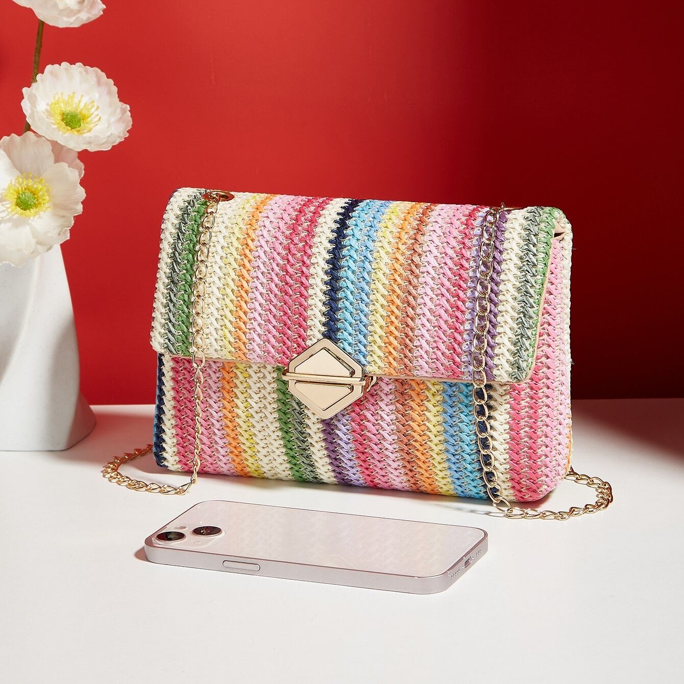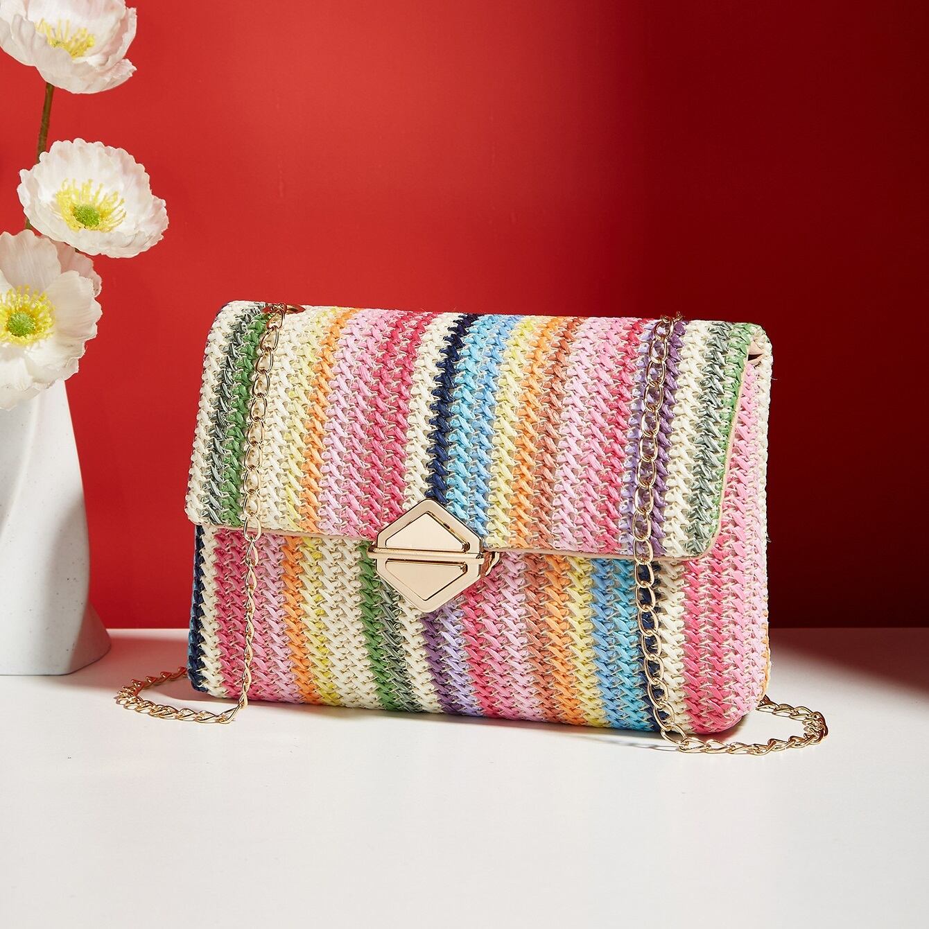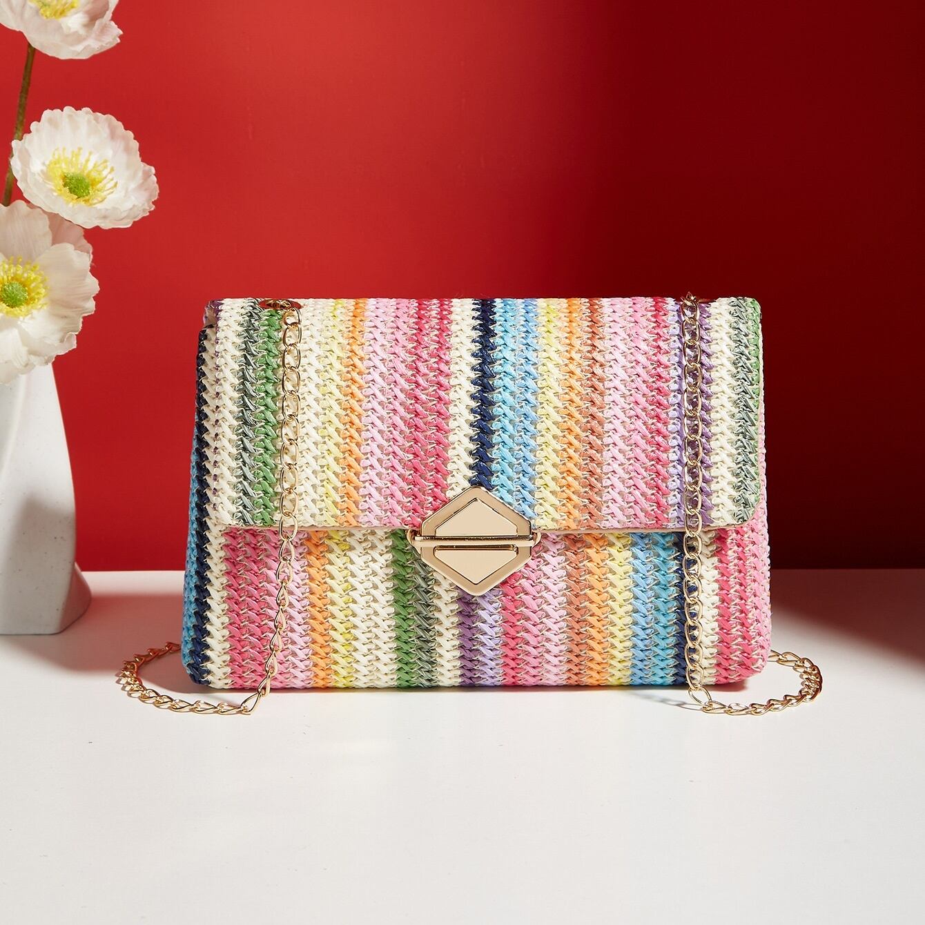 ハイセンスなマルチカラーストライプのクロシェ編みがポイントのチェーンバッグです。春夏のスタイルにぴったりのフレッシュなカラーリングが魅力です。ゴールドチェーンを2連にしてショルダーバッグやハンドバッグとしてもお使いいただけます。トレンドのボーホースタイルや、デニムなどとの相性もとても良いデザインです◎