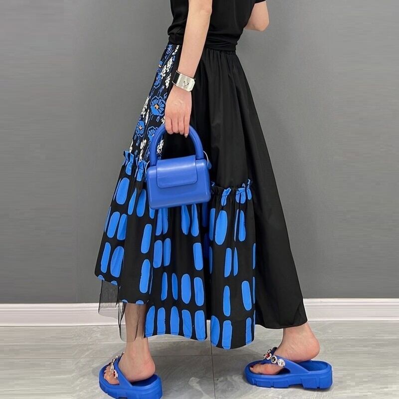 3種類のプリント柄とチュールをミックスしたロングスカートです。パターンのミックスとアシンメトリーのシルエットがハイセンスでフレッシュな印象に仕上がります。Tシャツやスニーカーと合わせるだけで、スタイリッシュなコーデが完成するおすすめのスカートです。