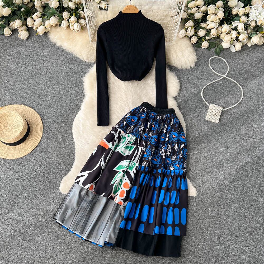 トリパターンミックス シフォンアレンジ ロングスカート ブルー/ブラック SK00185