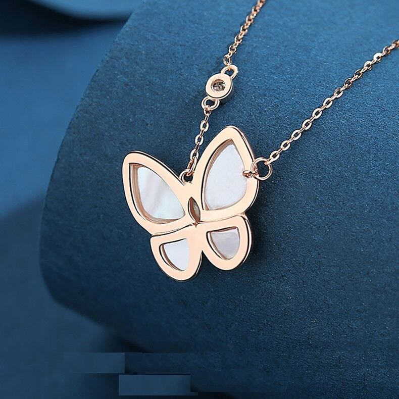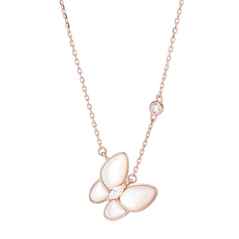 オパールのように光り輝く蝶のチャームがフェミニンなチェーンネックレスです。チェーンについた一粒ジルコニアもスタイリッシュなアクセントになっています。Tシャツなどカジュアルなスタイルから、エレガントなスタイルまで、幅広いコーディネートのアクセントにおすすめです。