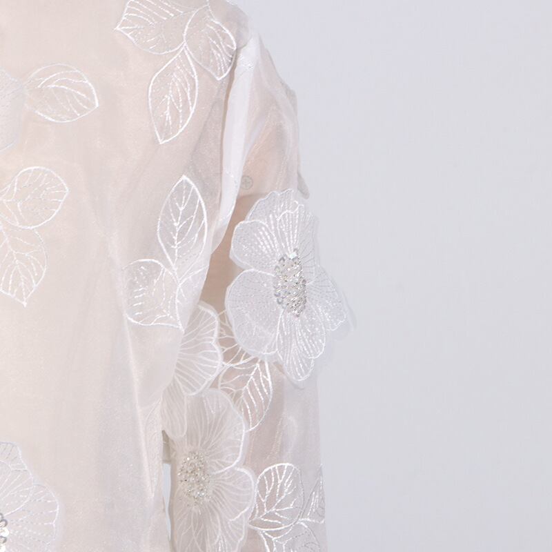 スパンコールでデコレーションされたお花の刺繍がロマンティックなシアーブラウスです。スカートでもパンツでも合わせやすいデザインです。サロペットやワンピースをレイヤードしたり、ジャケットのインナーとしても、幅広いスタイリングが楽しめます。