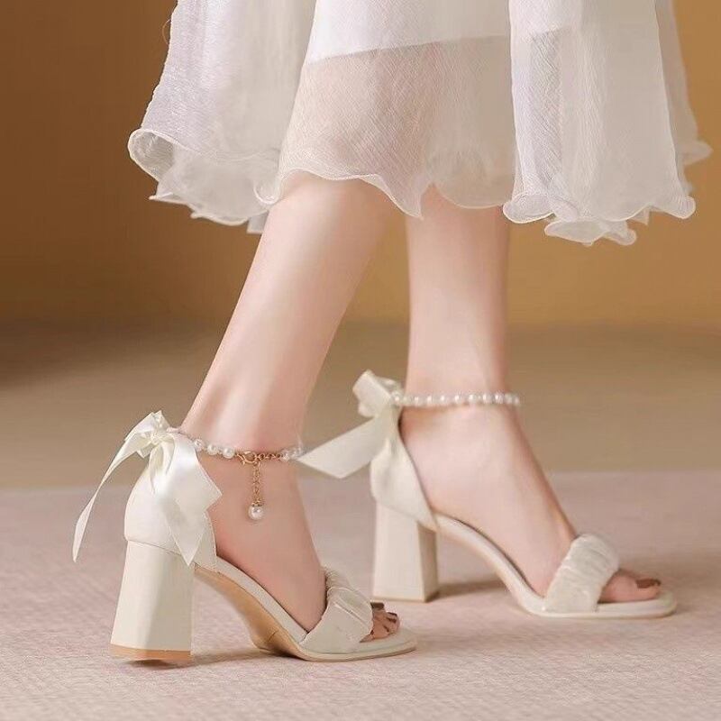 パールのアンクルストラップとバックリボンがロマンティックなヒールサンダルです。品のあるライトベージュとパールとサテンリボンのアレンジで、細部までフェミニンなデザインです。アンクルストラップでしっかりと足をホールドし、歩きやすさも◎。結婚式やパーティーなど、華やかなシーンがぴったりのヒールサンダルです。