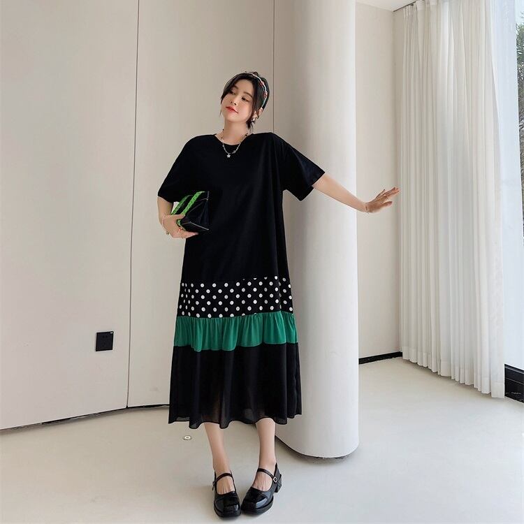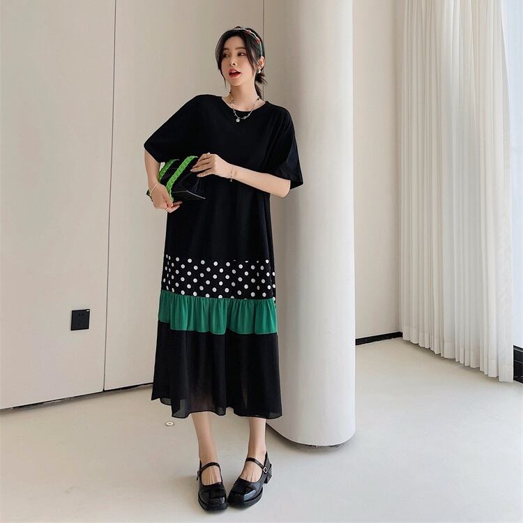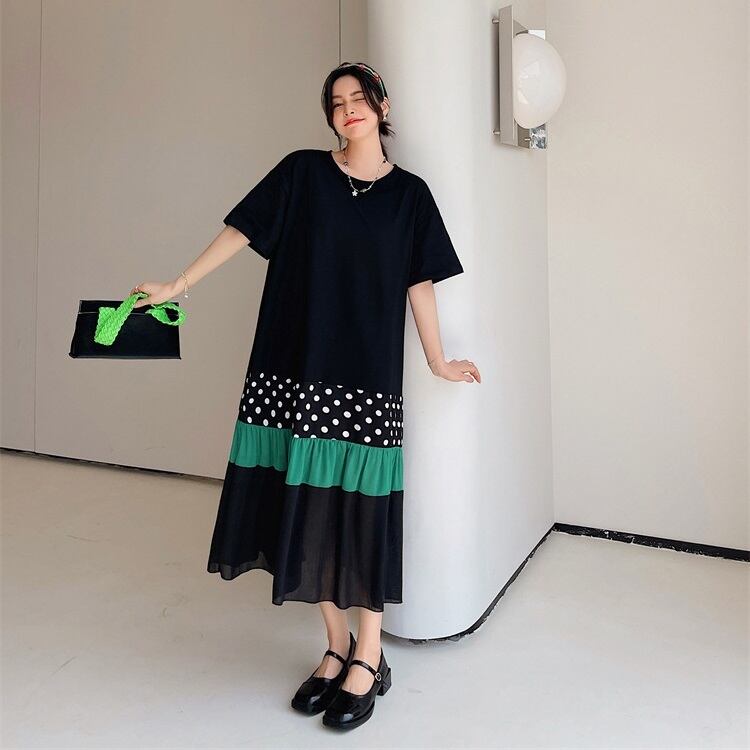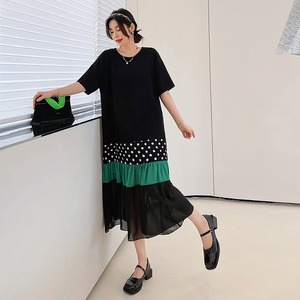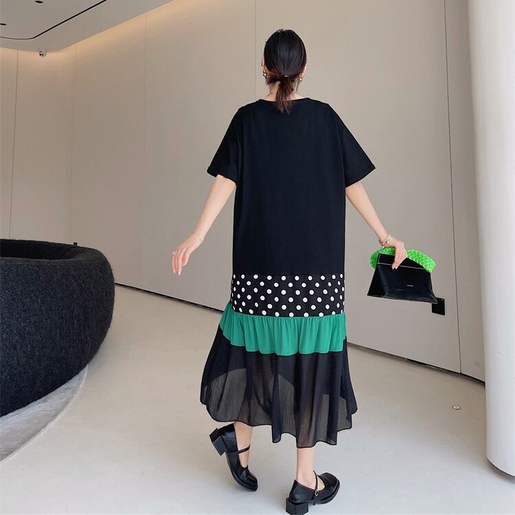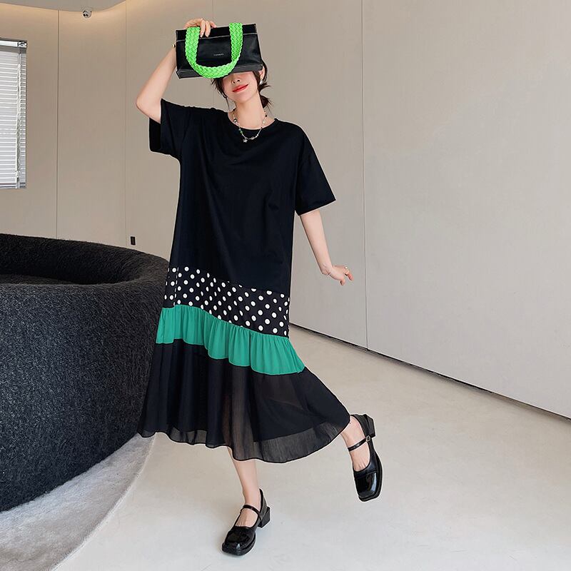 水玉やシフォンなど異素材ミックスがスタイリッシュなロング丈のワンピースです。オーバーサイズでゆったりめな作りになっています。暑い日も1枚でさらっと着こなせ、スニーカーやキャップなどとカジュアルなコーデも楽しめます。プラスサイズ対応アイテムです、Lサイズから3XLサイズまでサイズございます。妊娠中の方のマタニティドレスとしてもおすすめです。